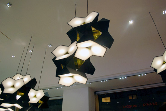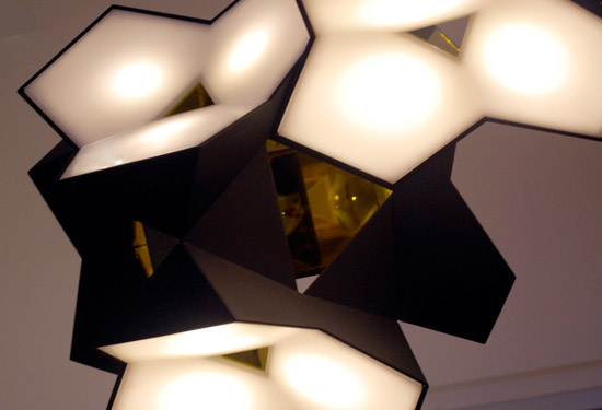 I found this older post on Design Boom: Sculptor Olafur Eliasson from Copenhagen created an interesting configurable geometric system prototype for sculptural pendant fixtures.