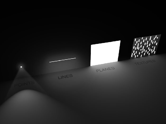 Above is a rendering I made to help explain a basic way to categorize light sources. Lighting can be broken down into three fundamental geometric categories: point sources, linear sources, and planar sources.