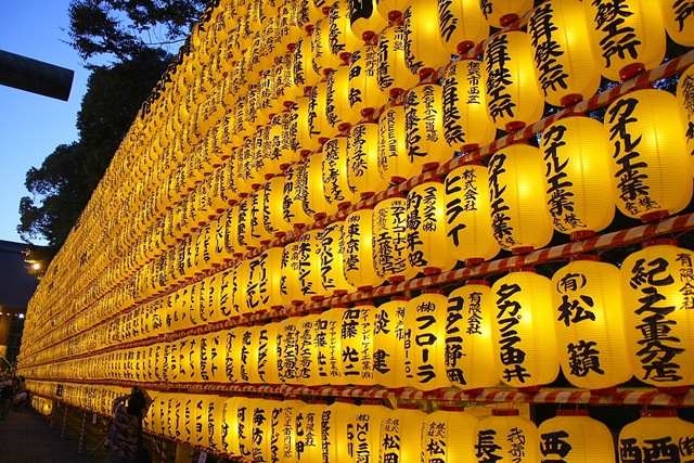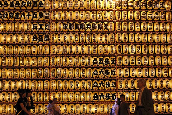 “People walk past paper lanterns during the Mitama Festival at the Yasukuni Shrine in Tokyo Tuesday. Over 30,000 lanterns light up the precincts of the site, where more than 2.4 million war dead are enshrined, during the four-day festival. ”
