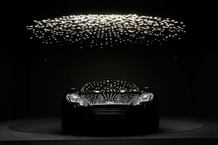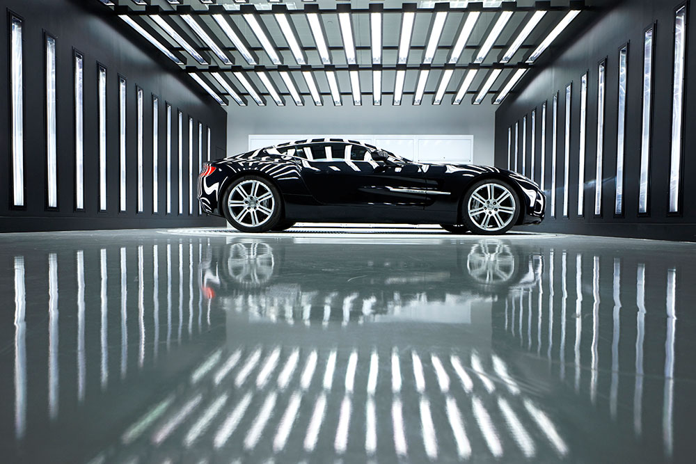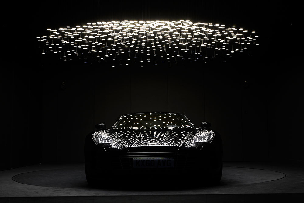 “When customers make the pilgrimage to Aston Martin headquarters to take delivery of their One-77s, each is treated to an unveiling experience that’s nothing short of theatrical. Seated in a satin black room, a uniquely composed musical sequence fills the space from a Bang & Olufsen sound system. Five hundred organic LED lights hanging like tiny chandeliers start pulsing over the vehicle with a heartbeat, creating wave-like movements across the roofline and evolving into a choreographed shimmer that grows in intensity, finally shedding full light on the sheet metal below. The tease culminates with a musical crescendo, a sea of photons and the reveal of an impossibly sexy supercar.”