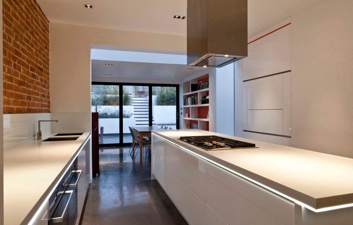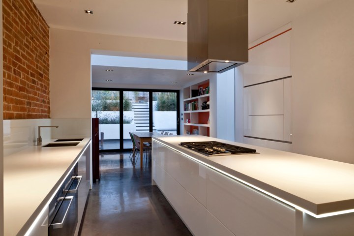 London-based Rousseau Design sent me this image of a kitchen design project they recently completed with integrated lighting just below the countertop. Nice detail…very subtle but it really energizes the space. The PR release emphasizes the play of different shades and textures of white throughout the space. Just a touch of “Tron” without pushing into garish techno-future terrority.
