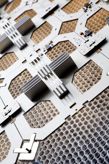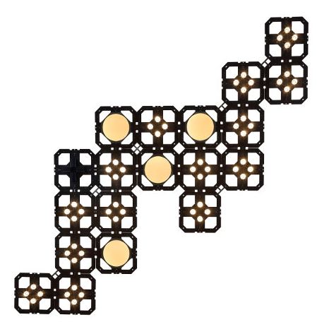The first is a modular tile system called Cluster+ used for suspended pendant installations or a in a floor lamp. The modules are available with either small LED spot lights or OLED panels; they can be used interchangeably. I have to say, their black-on-black design was the sexiest circuit board I’ve ever seen.