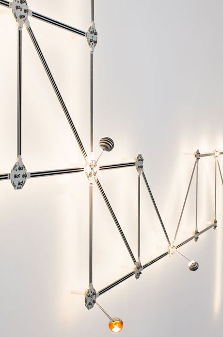 The second design, called Track Wall, uses thin, long circuit boards to create a lattice, mounted 4cm from a wall surface. LEDs mounted on the back side of the boards light the wall. Secondary spot lights can be added. Since it is all low voltage and low power, it makes artistic use of exposed conductors. Honestly, it is a strange system at first glance, but it definitely is a provocative concept that could led to many other interesting designs.