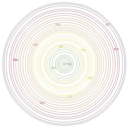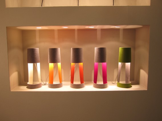 German firm Domus had a cool little desk lamp named Mia made out of heavy felt. I loved the five-in-a-row iMac-esque presentation of the color options. Also…Domus’ website had a nice infographic: Their product timeline displayed like the rings of a tree. I clipped it below.