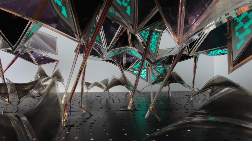 Phototropia is part of an ongoing series on the application of smart materials in an architectural context and was realized in April 2012 by the Master of Advanced Studies class at the Chair for CAAD. It merges self-made electro-active polymers, screen-printed electroluminescent displays, eco-friendly bioplastics and thin-film dye-sensitized solar cells into an autonomous installation that produces all its required energy from sunlight and responds to user presence through moving and illuminating elements. The generated energy is stored in batteries below the platform and then distributed via microcontrollers to the respective elements. Phototropia is a proposal for an experimental architecture that can decay while actively being renewed, as a response to our times of tremendous globalization, increased connectivity and digital identity.