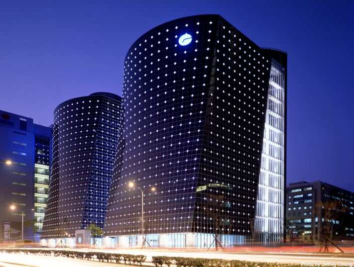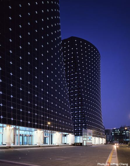 Cross-shaped LED lights mounted at the intersection of each window sash create the effect of constellations of shining stars on the buildings exterior – set against a pristine black, subtly curved glass façade that corresponds to the “flowing” shape of the Keeloung River which winds in front of the building.