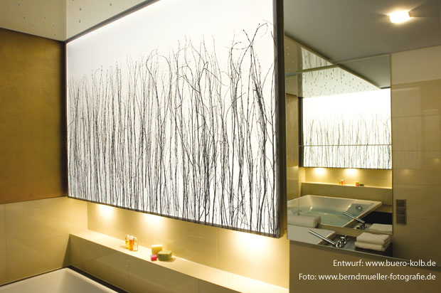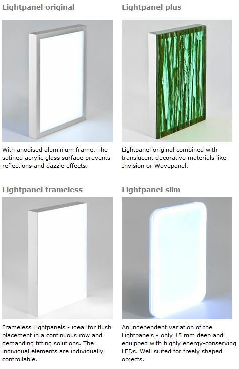 Designpanel from Nuremburg is a resin panel manufacturer for architectural applications, including a series of translucent colors, panels with decorative adders (such as meshes, organics, air bubbles, etc) and CNC-milled textures . They have a small series edge-lit LED panels called, appropriately enough, Lightpanel.