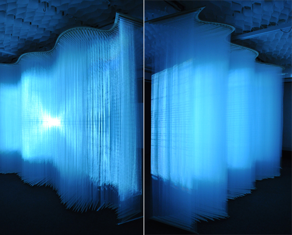 Projection One is an interactive art installation that was recently unveiled at Harvard’s Graduate School of Design. Conceived and built by Andrew Payne and fellow GSD student, Eddy Man Kim, Projection One strives to challenge the way in which users perceive projection art. We started by changing the projection surface. Our idea was simple – take the traditional screen and cut it up into strips of variable widths. Then rotate those strips to create a three dimensional surface; adding depth to create a more volumetric or spatial experience out of the projection schemes. The overall surface measured approximately 13′(length) x 9′(height) x 3′(depth).