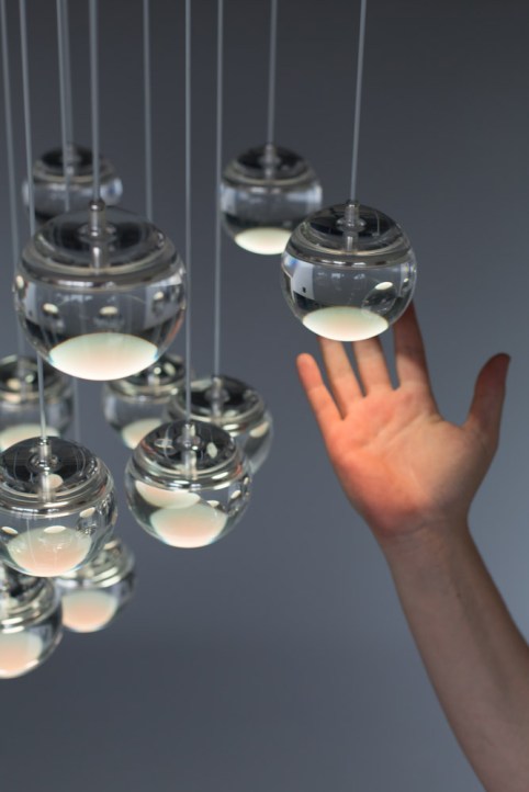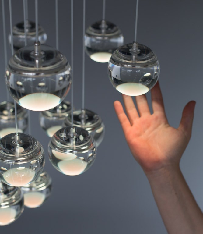 An elegant OLED chandelier project from Cinimod Studio, a creative design firm that brought to life the innovative lighting solutions for the SNOG chain. OLED panels from Philips Lumiblade are cast directly into acrylic orbs and animated with some subtle dynamic effects.
