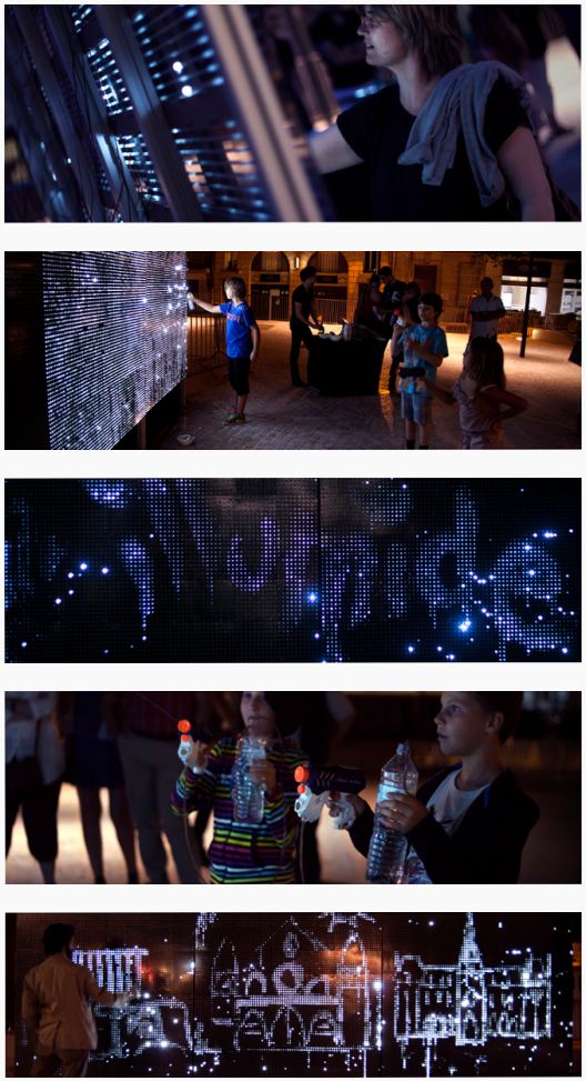 Digitalarti Artlab in Paris is showcasing a project by artist Antonin Fourneau, in which a custom LED wall lights-up when touched by water, and then slowly fades to black. Cool use of interactivity and one that I’ve not seen before. One question: How do the sensors refresh? Do you have to dry the screen each time?