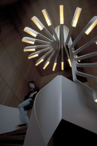 Via ArchDaily, a very cool custom light fixture from .PSLAB that is conceived as an integral part of a residential circular staircase design.