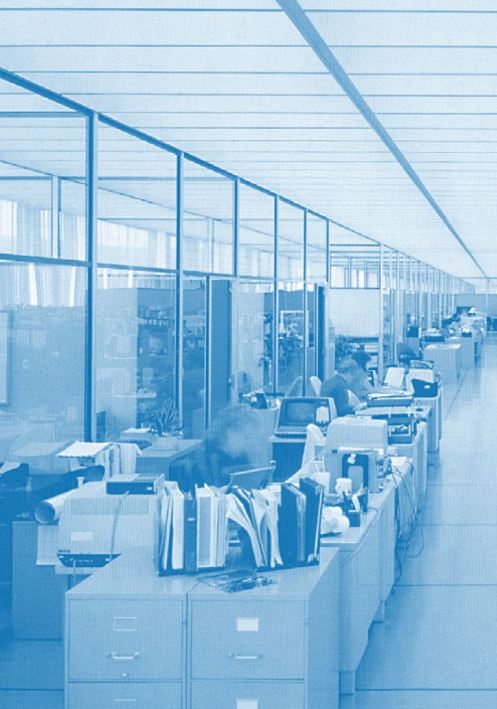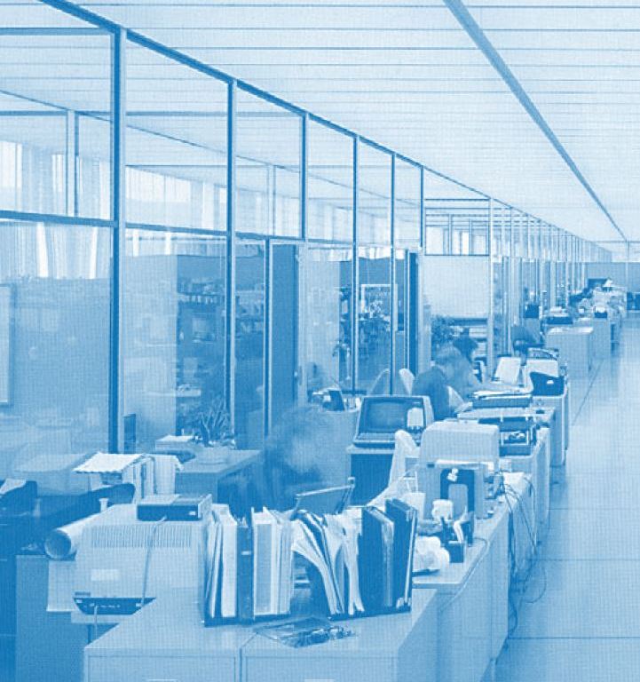 The research covers the transition from Victorian-era offices, which were small, almost residential affairs, to the mid-century Modern glass office towers with their extreme organizational rigidity. Lighting went from primarily daylight-filled spaces supplemented with directional, personal-scale incandescent lamps, to enclosed open-plan offices completely detached from natural light and washed-out with seemingly endless, diffused fluorescent ceiling panels.