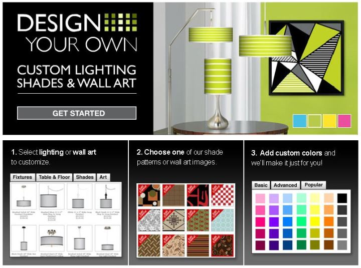 Not only can you mix and match a large collection of patterns to different sizes and styles of lamp shades, they even have a terrific web interface for customizing the colors of those patterns. A very strong “value added” service. Kudos!