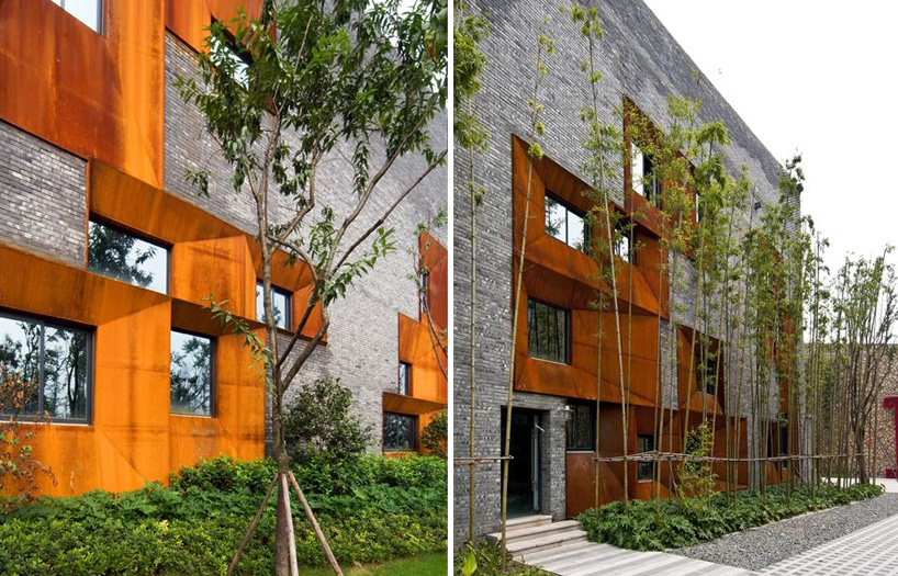 It looks like there is a ring of light surrounding each window, adding a wonderful luminosity to the rust-colored Cor-ten steel “angular cuts” in the facade. The detail must be well hidden though, because you can’t see it in even the close-up daylight views: