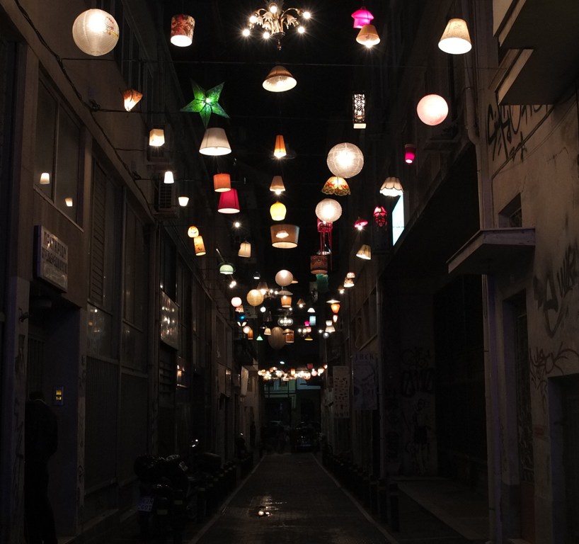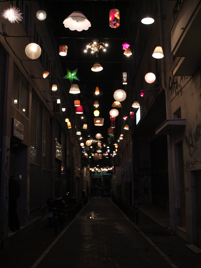 located in the heart of athens, a small street within the monastiraki area is host to a lighting installation.
