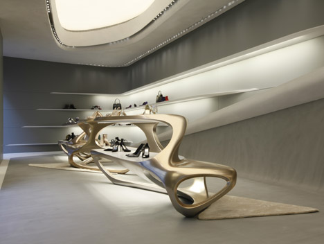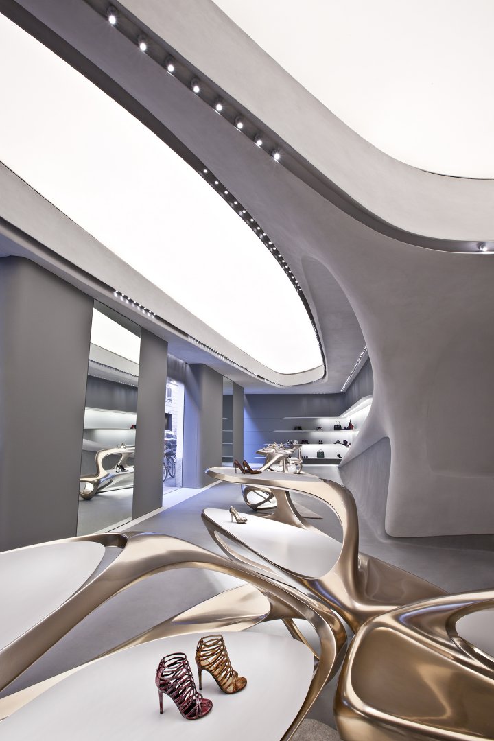 Totally trumping Tom Cruise in the “futuristic” department, check out the new Milan flagship store for shoe brand Stuart Weitman by Zaha Hadid. I love the uniformity of the large, amorphous luminous ceilings, the minimalist detailing of the light slot around the perimeter, and the incredible thinness of the luminous shelving system.
