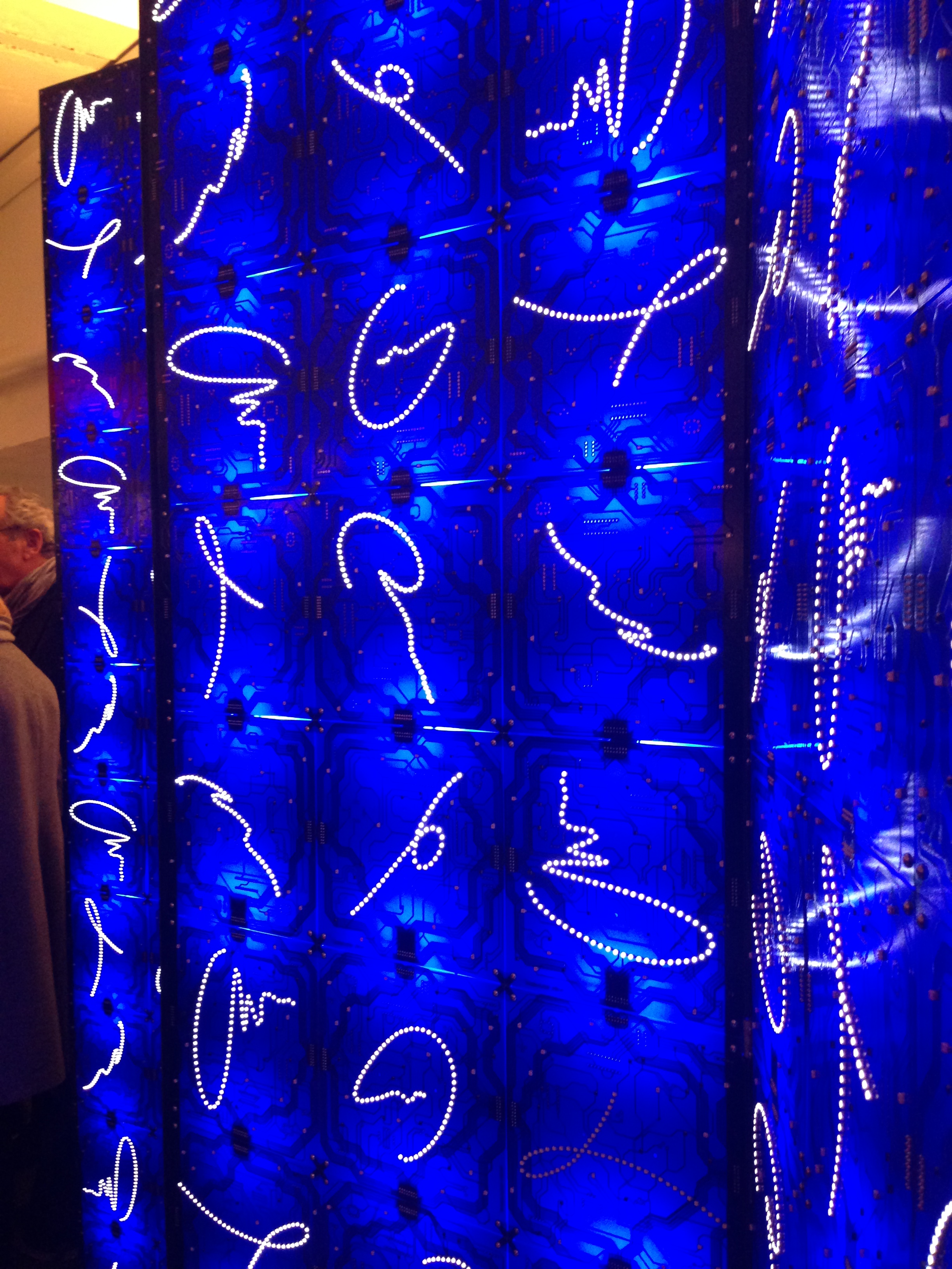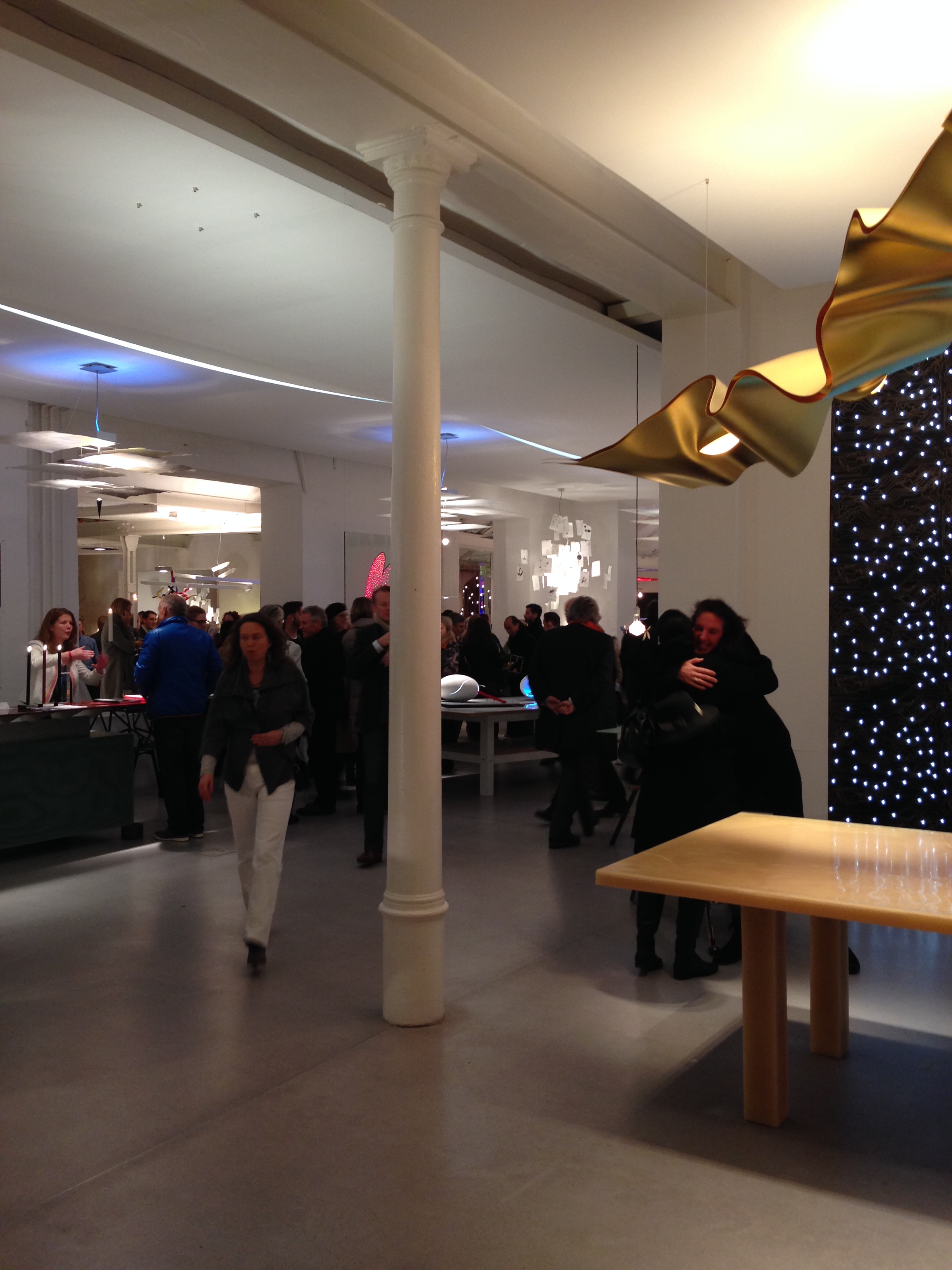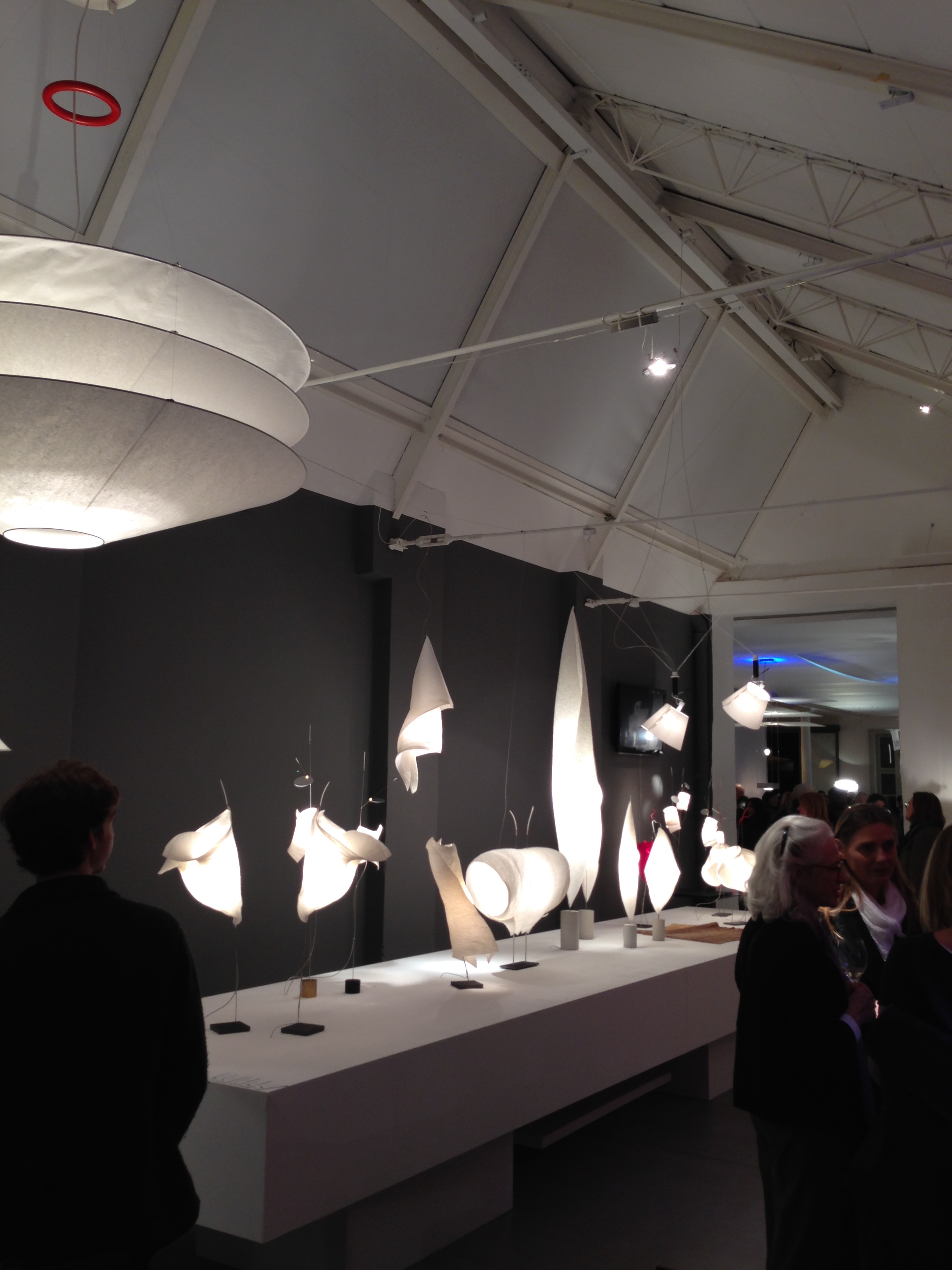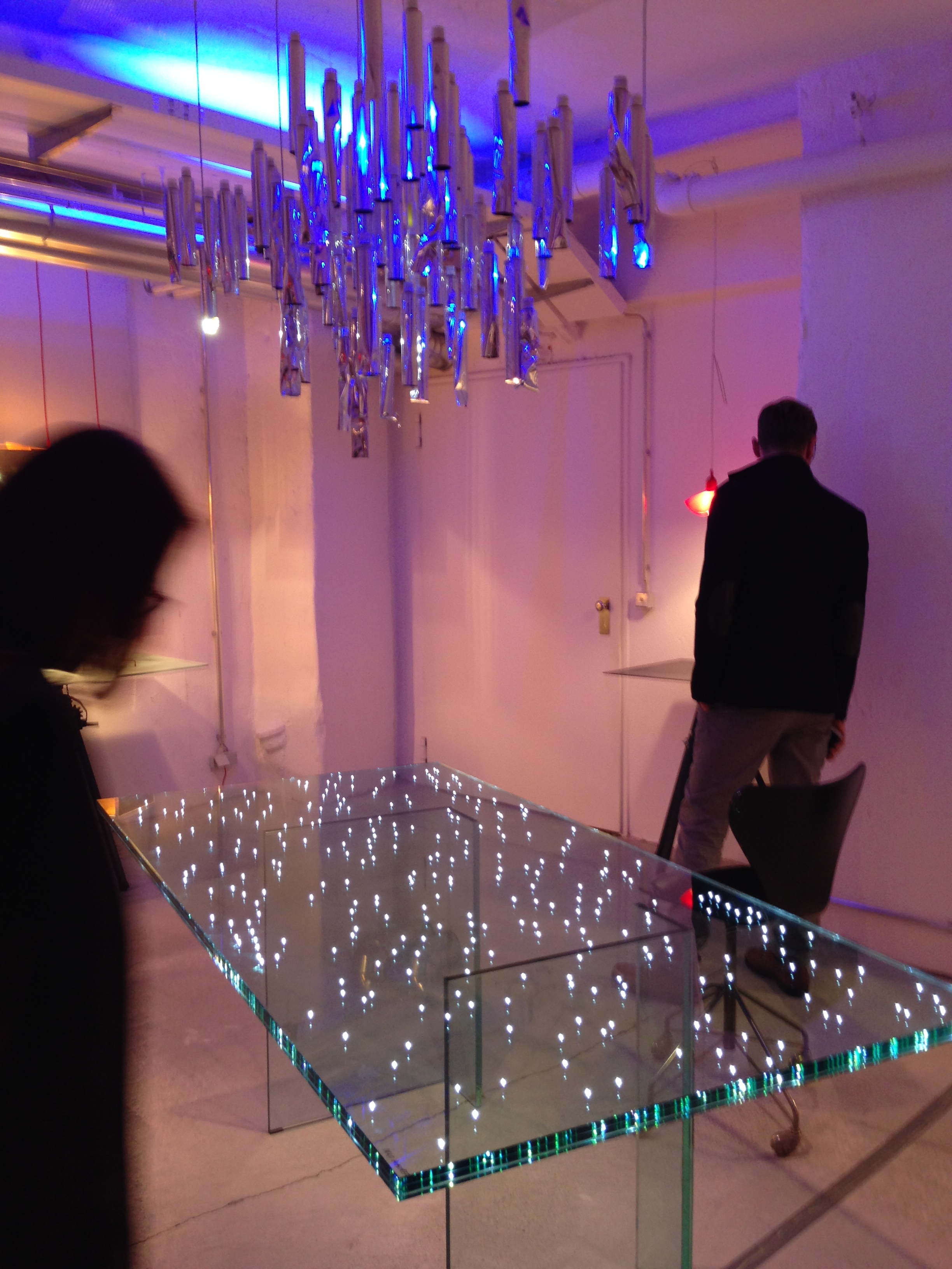As part of last week’s Strategies in Light Europe conference, Ingo Maurer opened their Munich studio to the public. Ingo Maurer was apparently in NYC, but still his showroom gallery is a really cool place…good vibes. Seems like it is an old manufacturing facility with saw-tooth roof, but mostly white-washed as a very lively backdrop to Ingo’s collection of light art. Unfortunately, all I had was my iPhone camera, but I grabbed a few shots. I love the LED wallpaper and the divider wall made of blue printed-circuit-boards which are back-lit.