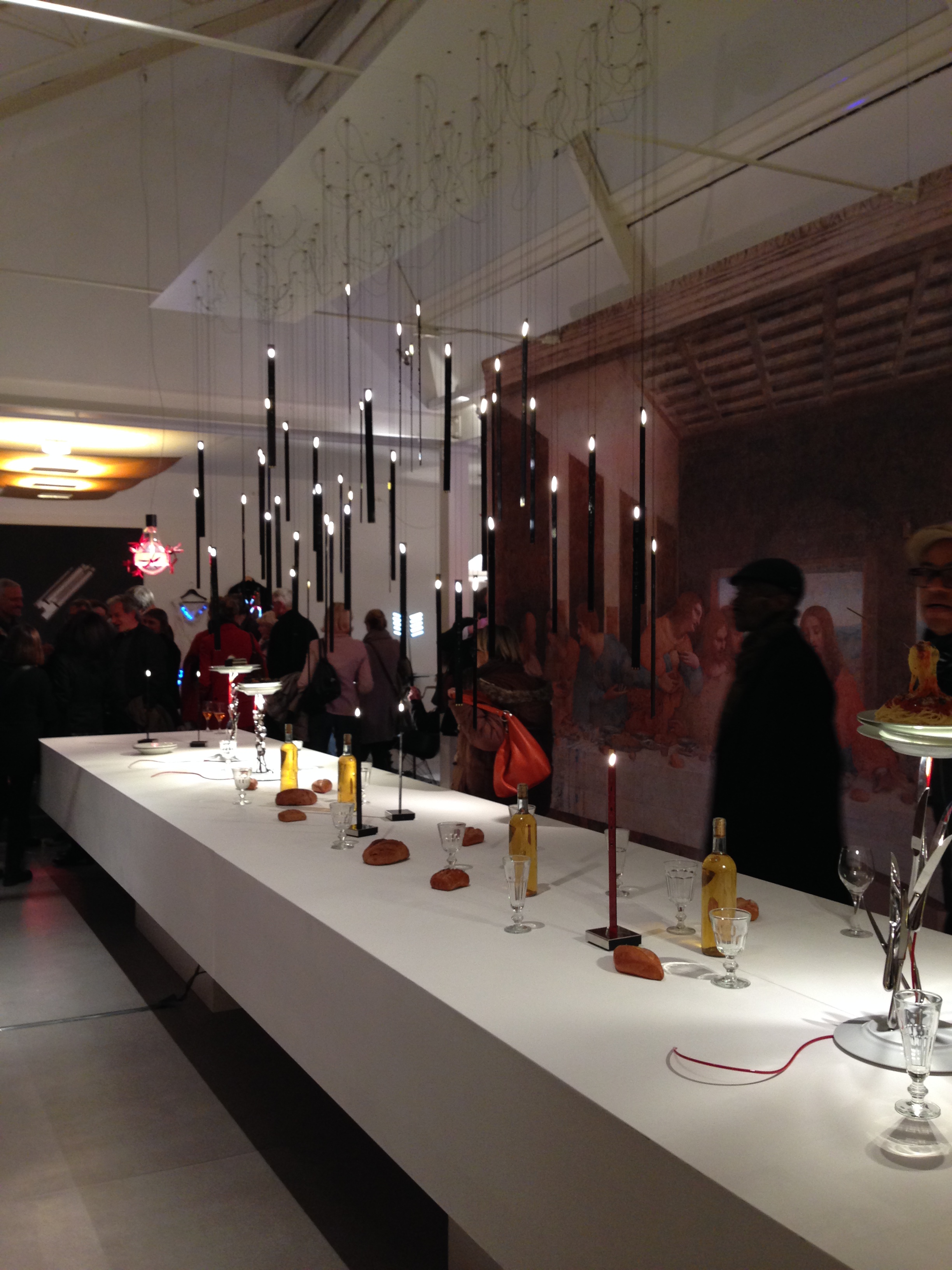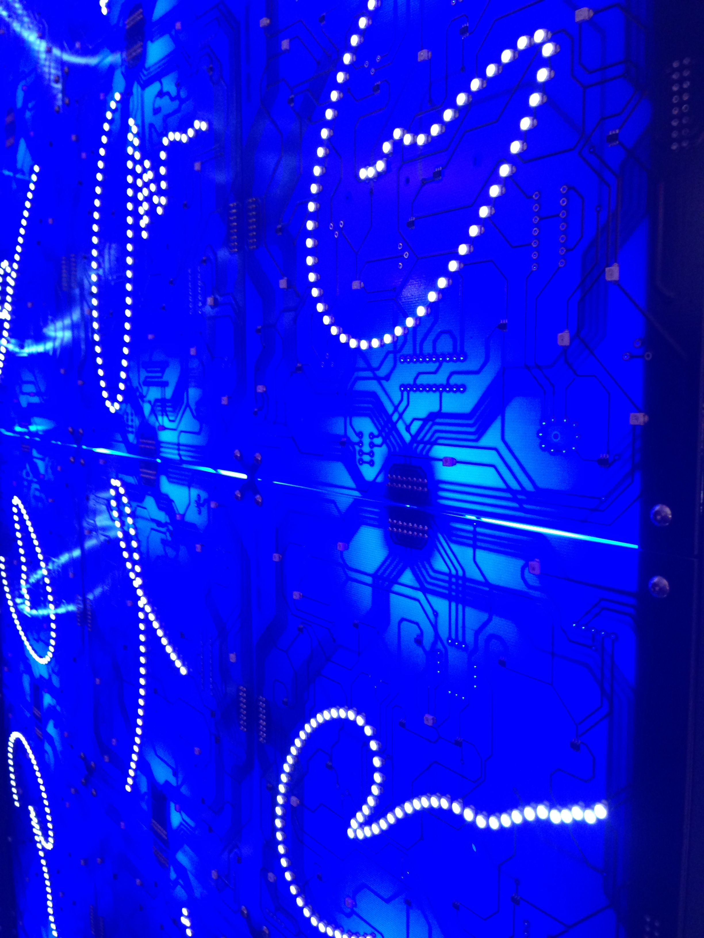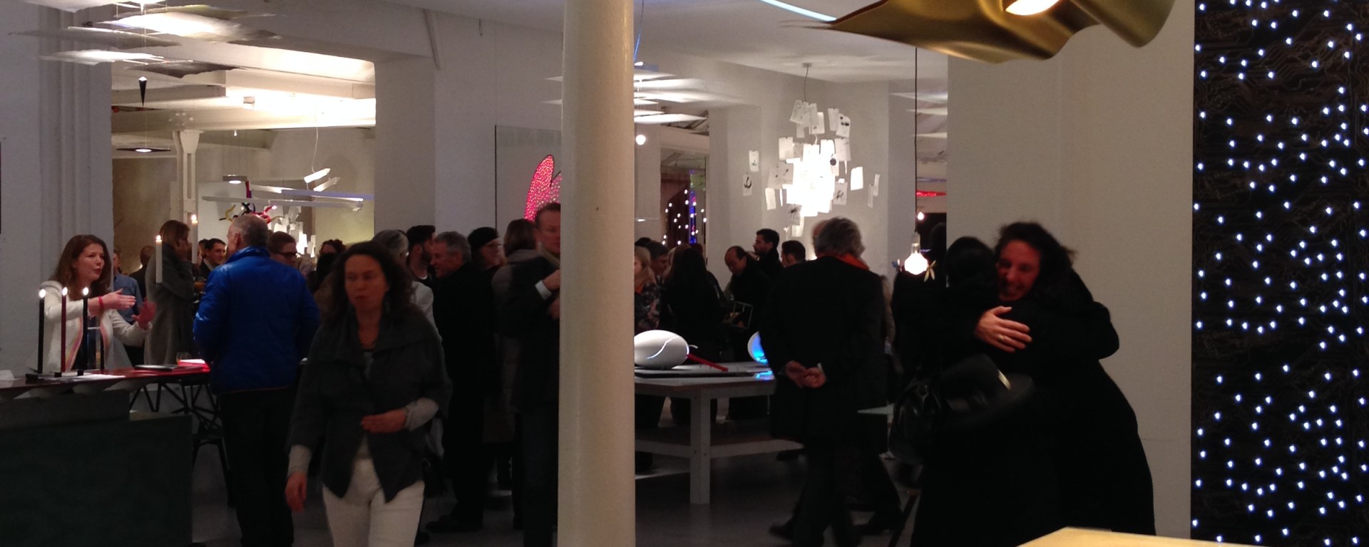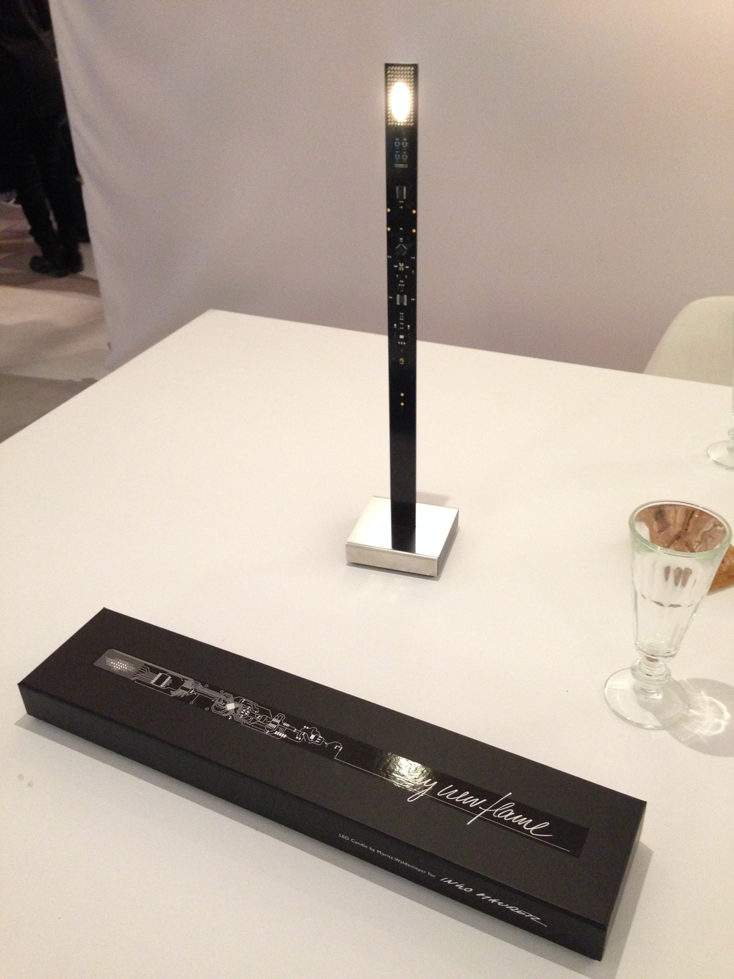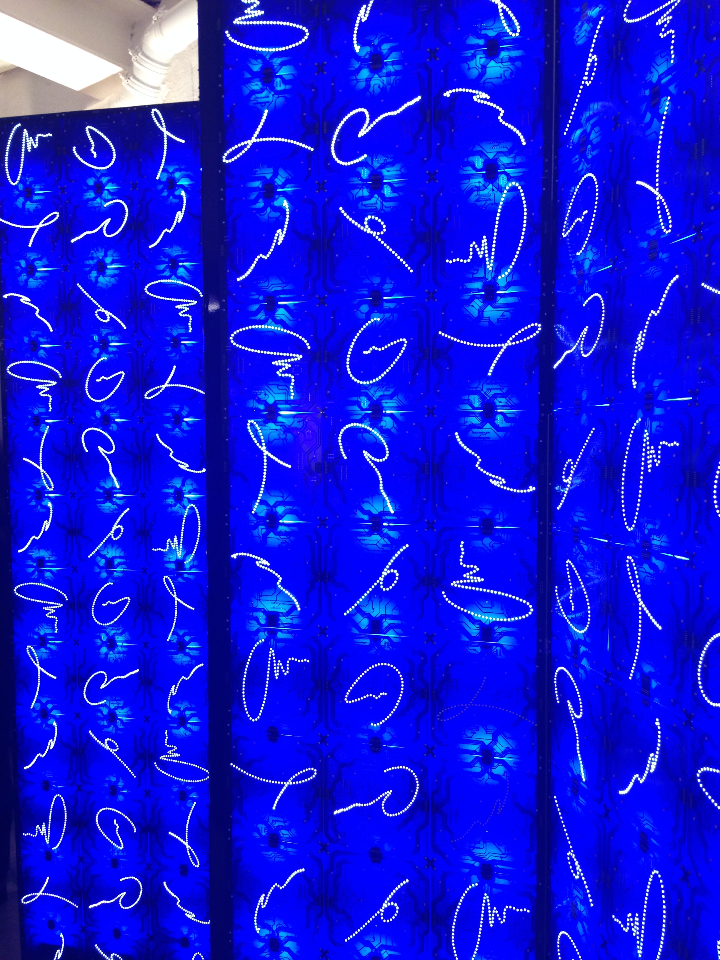 As part of last week’s Strategies in Light Europe conference, Ingo Maurer opened their Munich studio to the public. Ingo Maurer was apparently in NYC, but still his showroom gallery is a really cool place…good vibes. Seems like it is an old manufacturing facility with saw-tooth roof, but mostly white-washed as a very lively backdrop to Ingo’s collection of light art. Unfortunately, all I had was my iPhone camera, but I grabbed a few shots. I love the LED wallpaper and the divider wall made of blue printed-circuit-boards which are back-lit.
