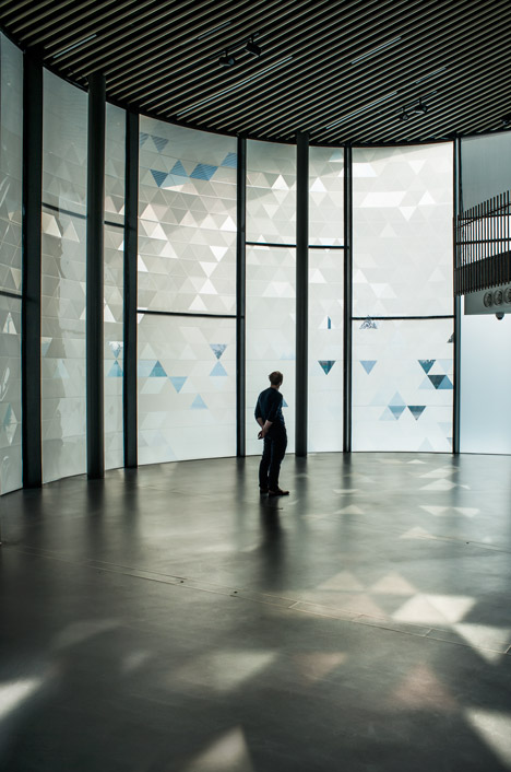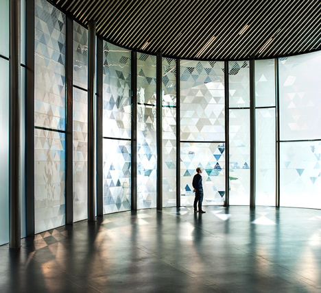 The effect of Simon Heijdens’ Shade installation is created using sheets of responsive film fixed to glass panels – a technique the London-based designer debuted at the Art Institute Chicago in 2010.