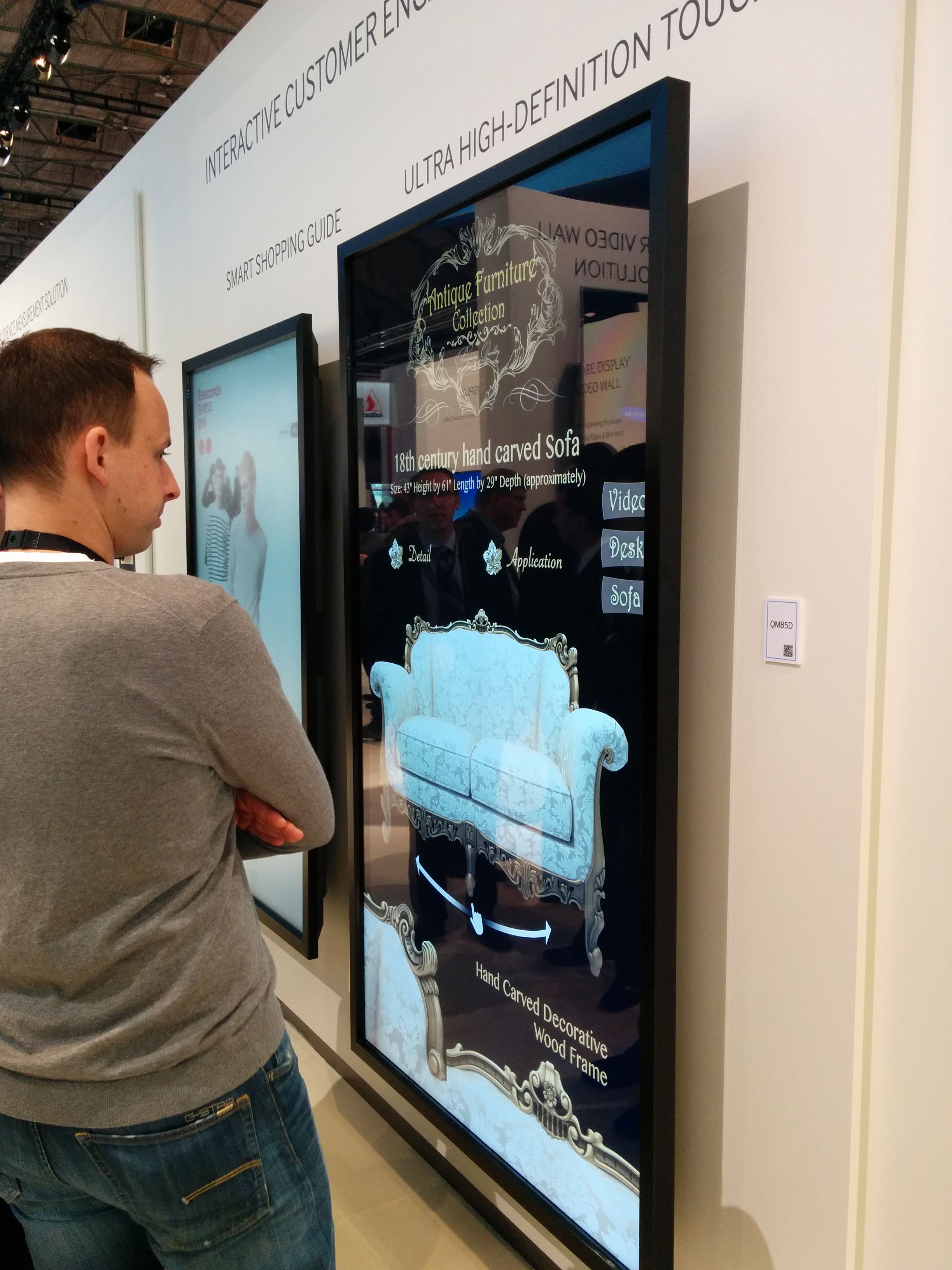 - Massive display surfaces: LED displays have reached a technical milestone, dropping below 2mm pixel pitch, with some even at 1.5mm pitch. The difference is amazing, leading to crystal clear, seamless, super brilliant HD LED displays at the scale of large architectural walls. Even LCD screens at 98″ and above become architectural-scale features, especially in a vertical orientation. Every major manufacturer had a gigantic LCD screen with integrated multi-touch interface.