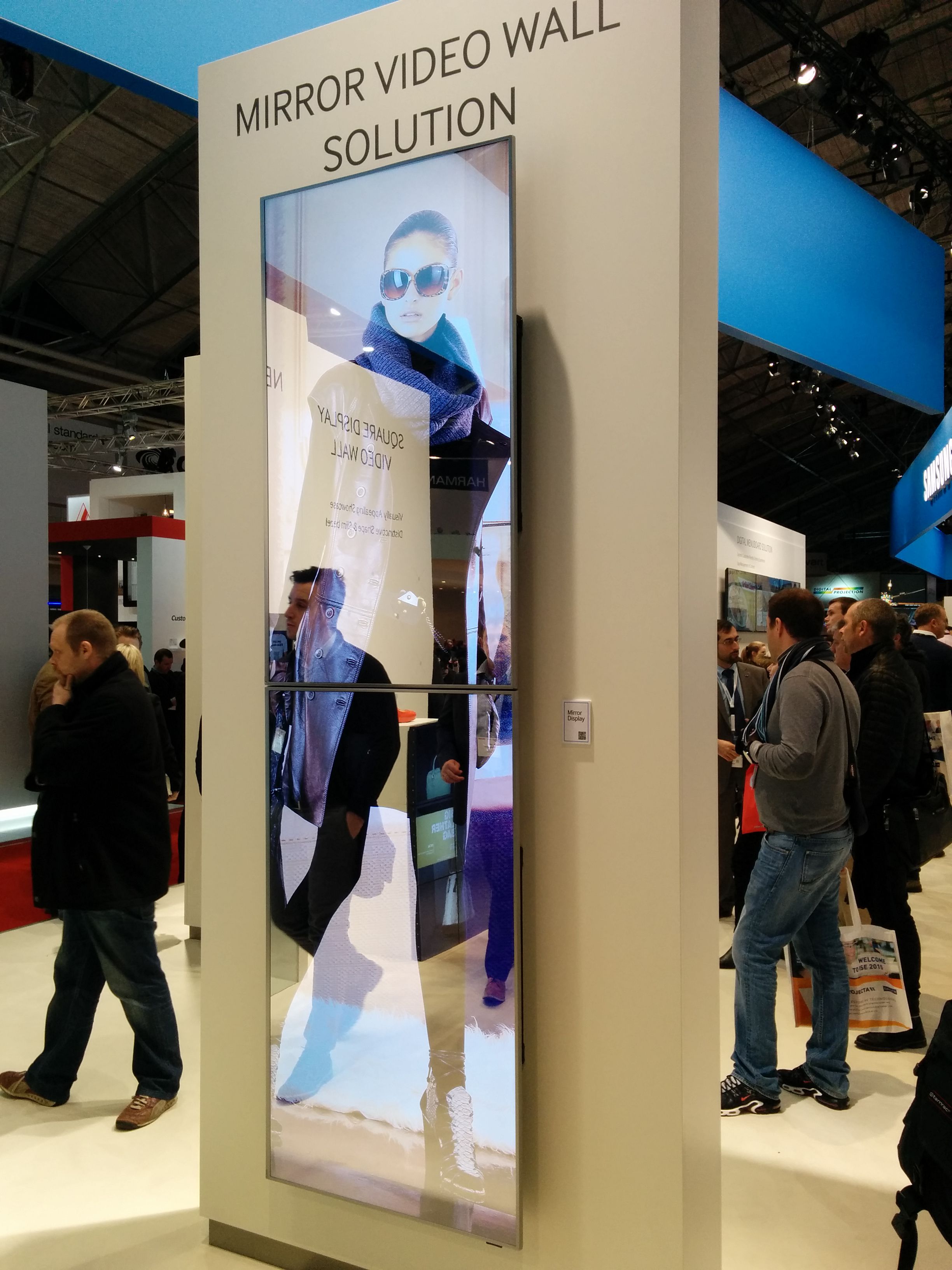 Simple enough: LCD screens from Samsung with mirror finishes. The screen is readily visible when active, but the surface is a basic mirror. This creates opportunities to fuse reflections with content.