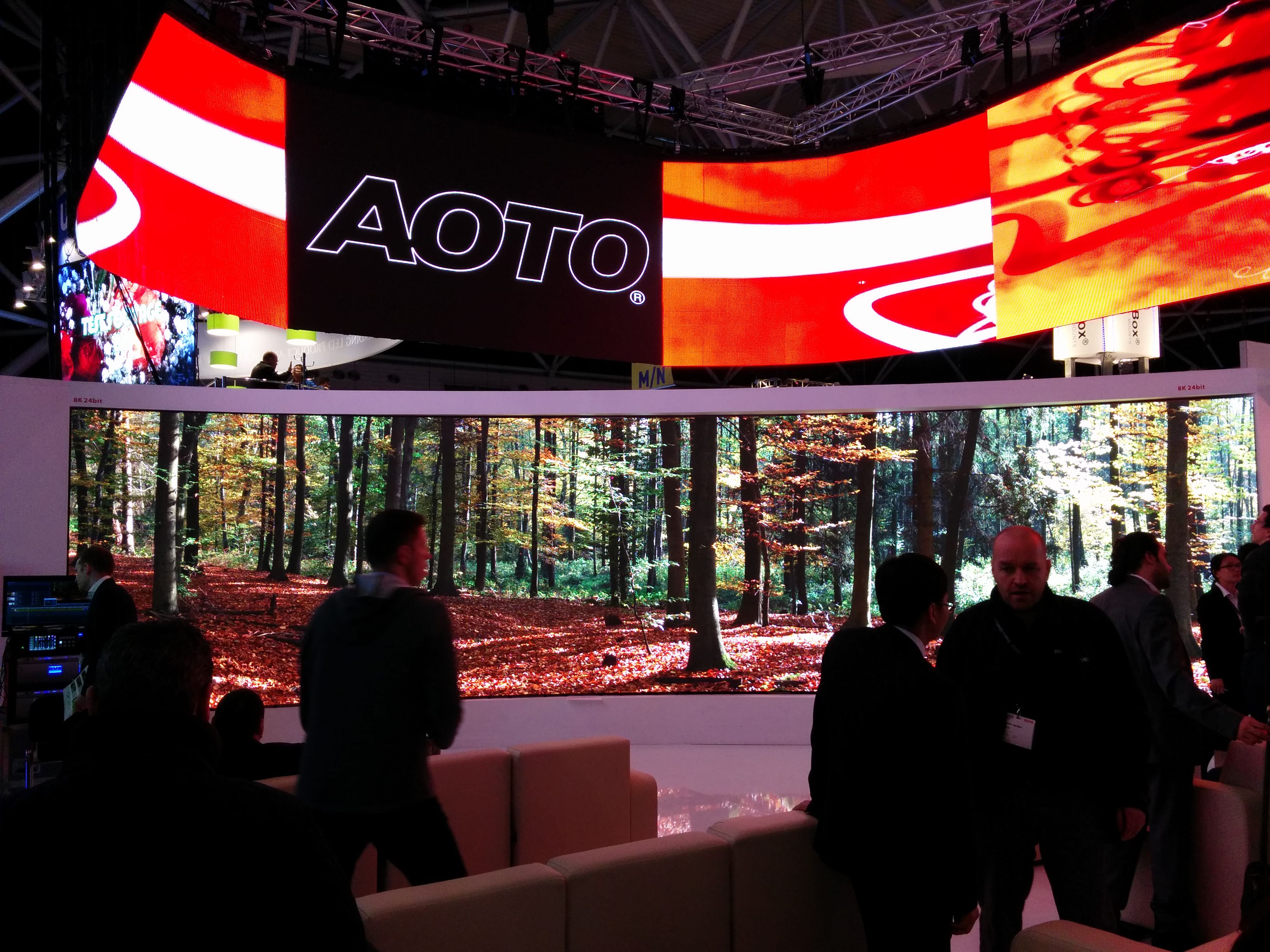 The screen at the bottom (showing a forest scene): AOTO was demonstrating a 2mm pixel pitch, 8K resolution screen. Hyper realistic effect — those trees are nearly life size and look vivid.