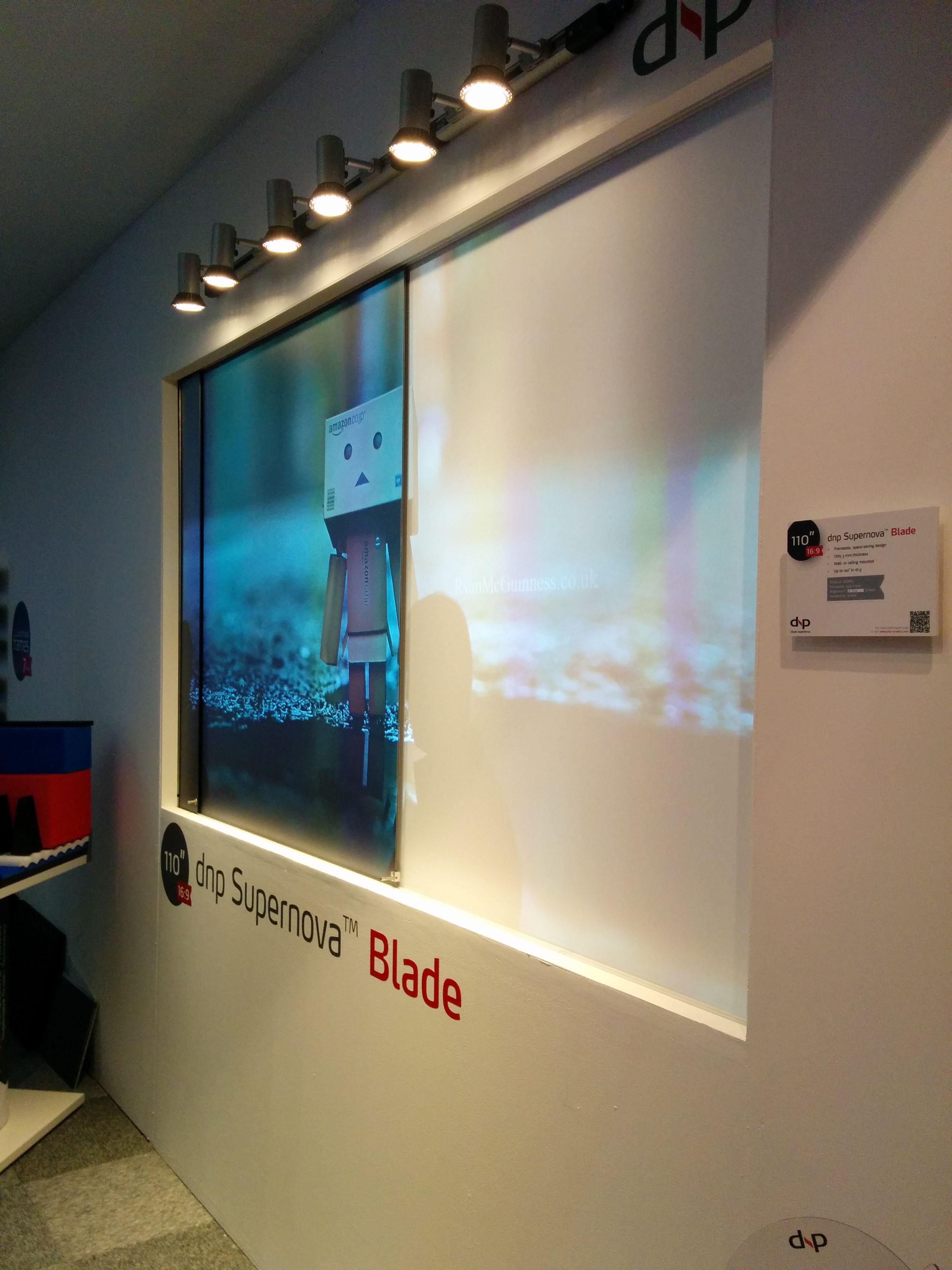 I don’t know the science behind it, but DNP Screens had a rigid screen that nearly completely swallowed up stray light. Notice the line of PAR lights at the top, and how bright the traditional projection appears on the right – the DNP screen of the left maintains rich blacks.