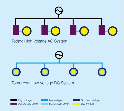 Via LEDsMagazine: Tridonic is launching a DC-based system architecture for its light engines. Using a central AC/DC converter makes sense for both reducing the number of components in a system (one power supply vs. a power supply for every fixture) and for increasing conversion efficiency. Some losses occur due to the lower voltage of the connections, but in my opinion the benefits are clearly compelling: DC systems fundamentally lead to greater sustainability at lower cost, including lower material usage, simplified fixture designs and the potential to directly connect to lower power generation like solar photo voltaic systems, without the higher-level DC/AC conversion normally used.