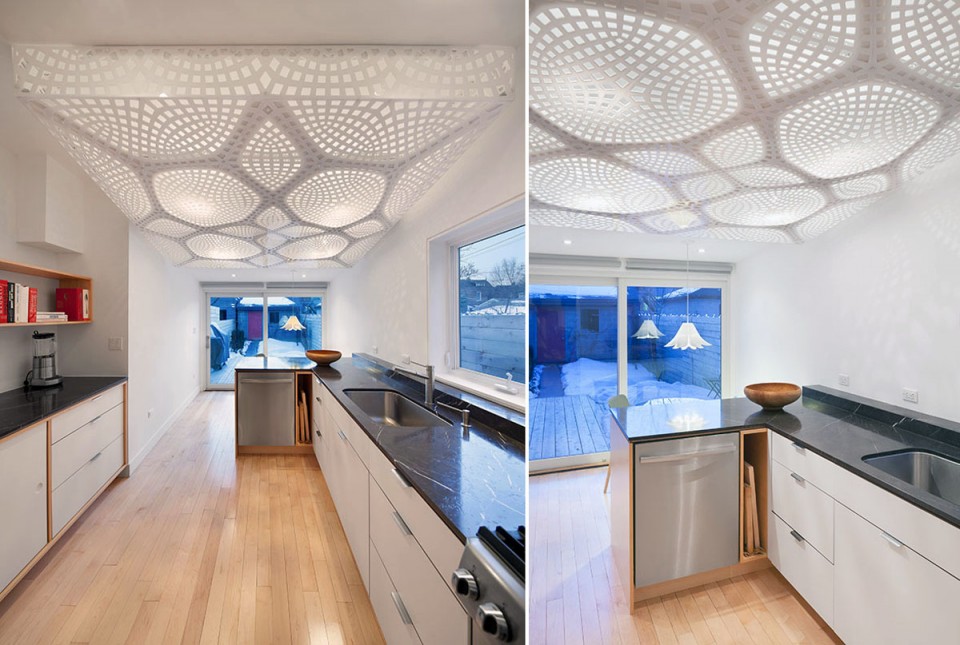 Very interesting parametric-designed luminous ceiling installation at a private residence by Toronto firm Denegrib Bessai Studio.