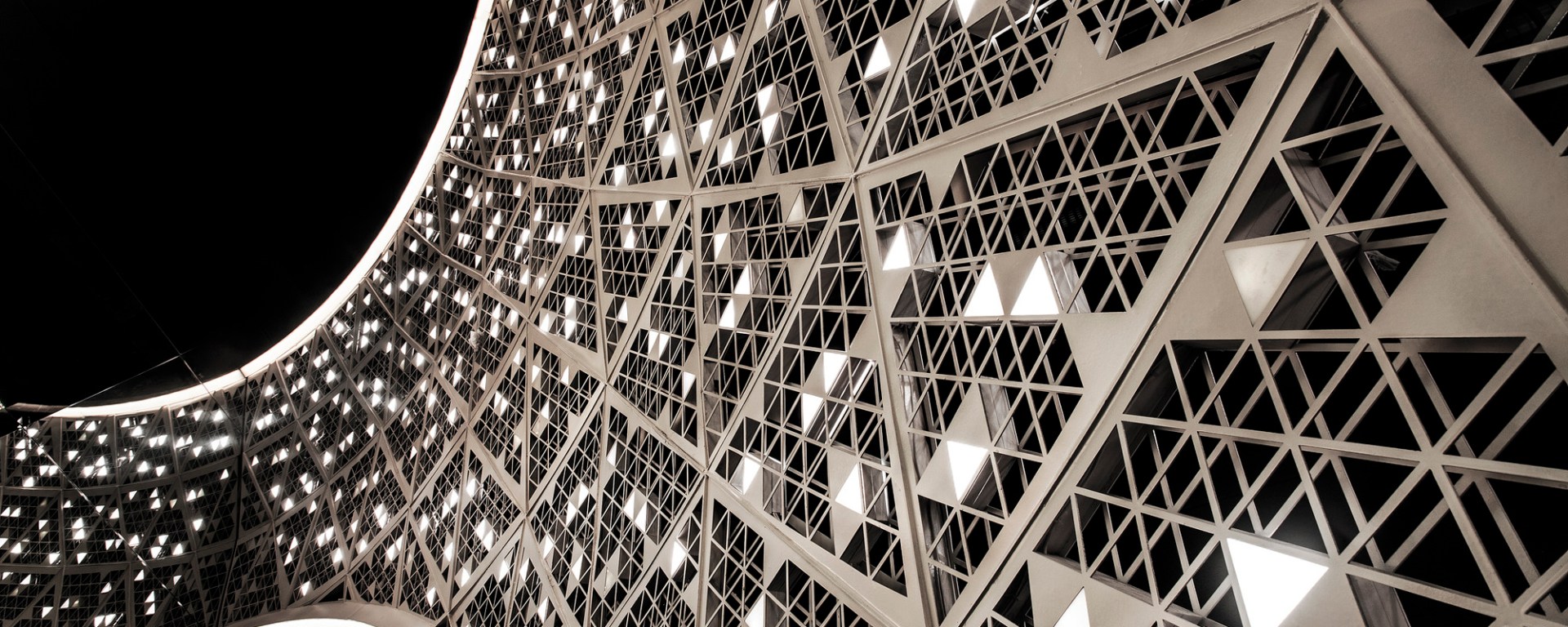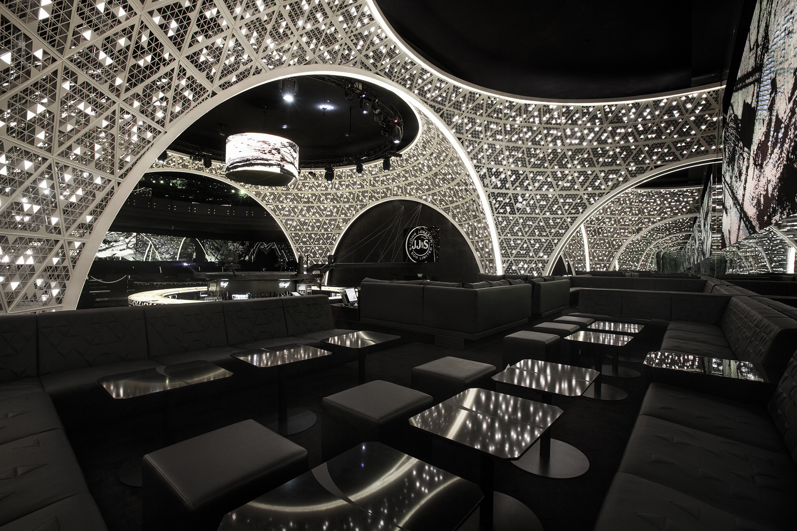 Night Flight is a mega-sized lounge designed by Bulgarian interior design firm Studio Mode. The central vaulted arches are constructed of triangulated patterns that include gorgeous integrated patterns light.