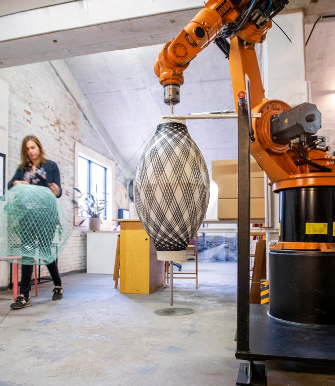 Atelier Robotiq is a Rotterdam-based startup using CNC-woven lightweight 3D structures for decorative pendants.