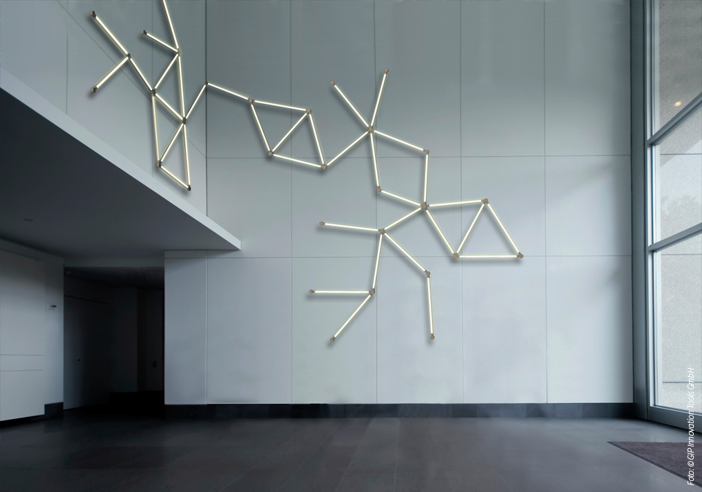 Ligeo is an interesting lighting concept from German company GiP Innovation Tools, which I came across at the recent Euroshop 2017 show. I love how they took the essence of a pure line of light and “structuralized” it into a dimensional construction system, with a very interesting and flexible hinged joint system. Add a variety of lengths, angles, and some basic trigonometry and presto – you can create some wild forms, ranging from highly regular ’80’s style “space frames” to meandering flowing forms.