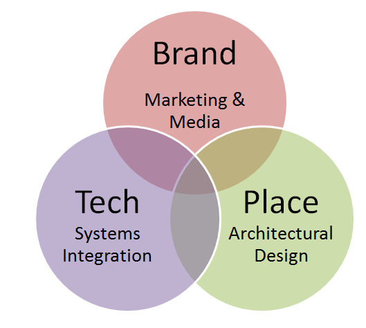 There are few companies that truly integrates all three areas – brand, tech & place. There are architectural/interiors firms that get into experiential brand design – a good example is UXUS in Amsterdam. There are systems integrators that have moved more towards holistic design and solutions – an example is TEECOM from San Francisco. Signage suppliers are creating ever more advanced systems – like RMG Networks out of Dallas. Then there are the usual specialist suppliers – media creation, app/software developers, lighting consultants, A/V consultants, etc. But there is clearly a missing synergy and efficiency that might be gained from having all three areas “under one roof.” One example that is close is Dan Pearlman from Berlin.