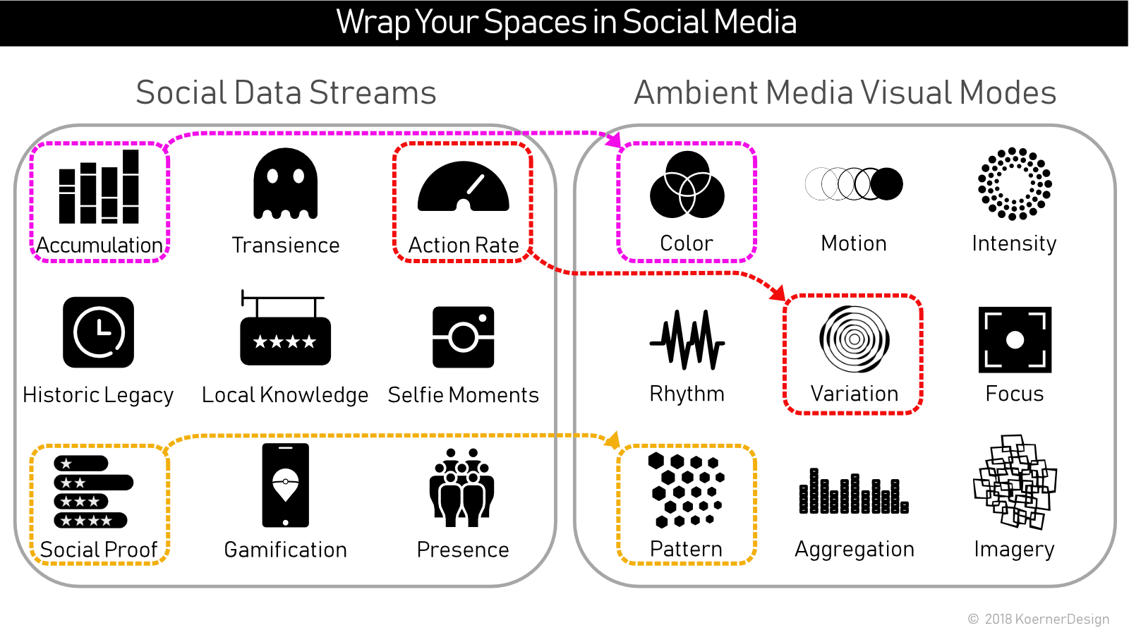 Let’s chart the three examples presented above, exploring how social data streams can be mapped to ambient media visual modes:
