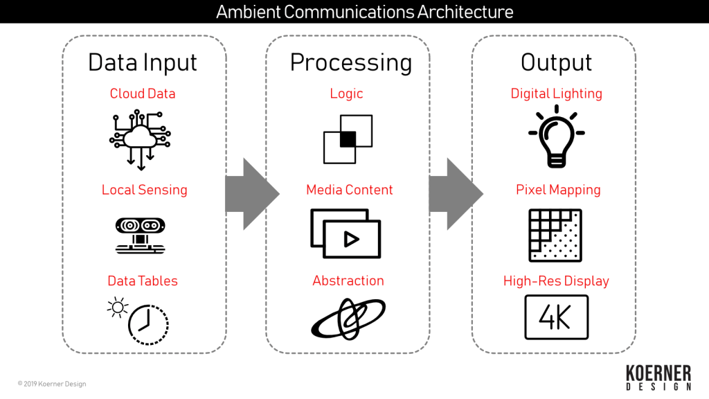 Behind the scenes, new control system paradigms must be adapted. Controlling the flow of data inputs, processing it via logic and abstraction systems, and controlling its output to a wide variety of “pixels.” Modern control systems will look like this: