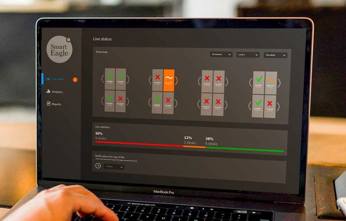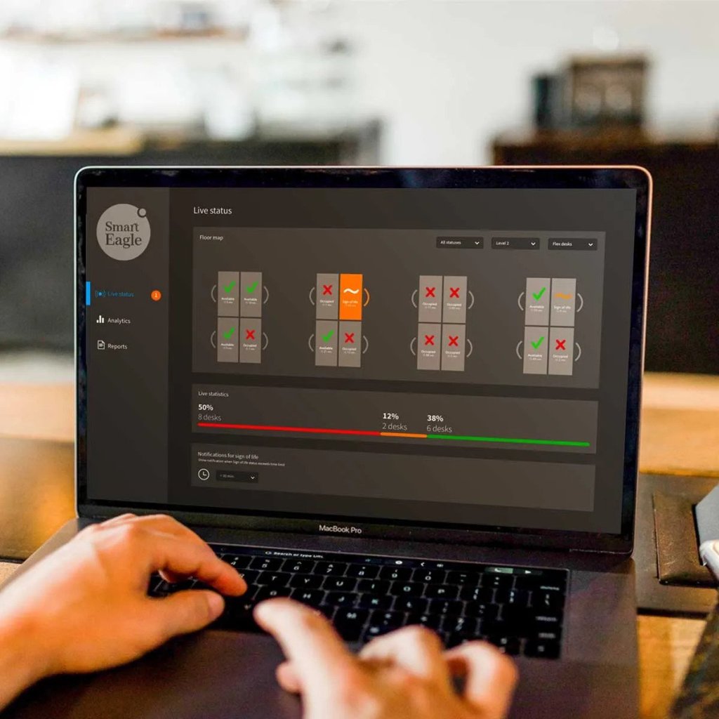 SmartEagle is a Dutch-based spinoff of IoT-development company Evalan that uses camera-based sensor systems and AI to accurately detect and analyze desk usage in office environments.