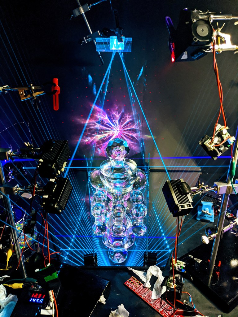 Cool article on the The Verge about Lewie Wilkinson, a guy who creates stunning art pieces using lasers, glass, mirrors…and plain old smartphones for cameras. And he shoots these in a walk-in closet off a bedroom that he uses as his “studio.” Super clever. Very trippy ’80s poster styles!