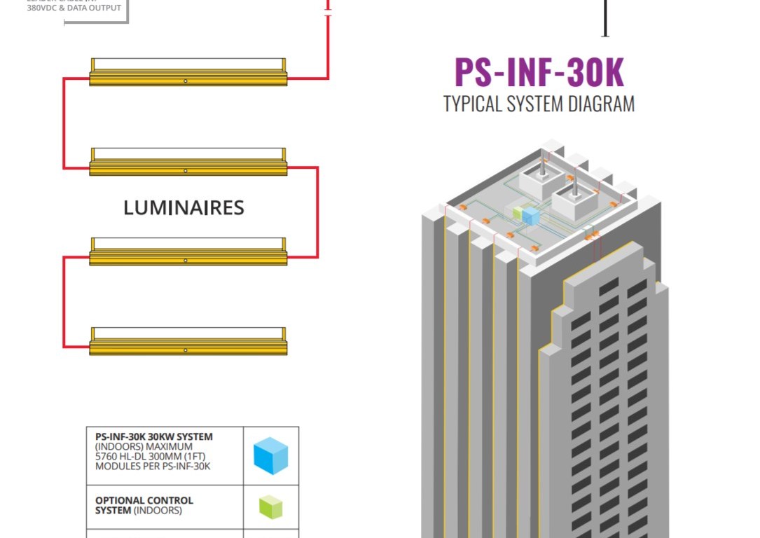 GVA Lighting recently launched their Infinity series, which capitalizes on the inherent system-level benefits of using 380V DC-power for long runs of LED fixtures. GVA claims they can achieve over 300m/1000ft long runs from a single power/data connection, which is ideal for decorative exterior lighting of buildings where projects want to eliminate penetrations through the curtain wall cladding and having to deal with power/data supplies spread throughout various tenant spaces.