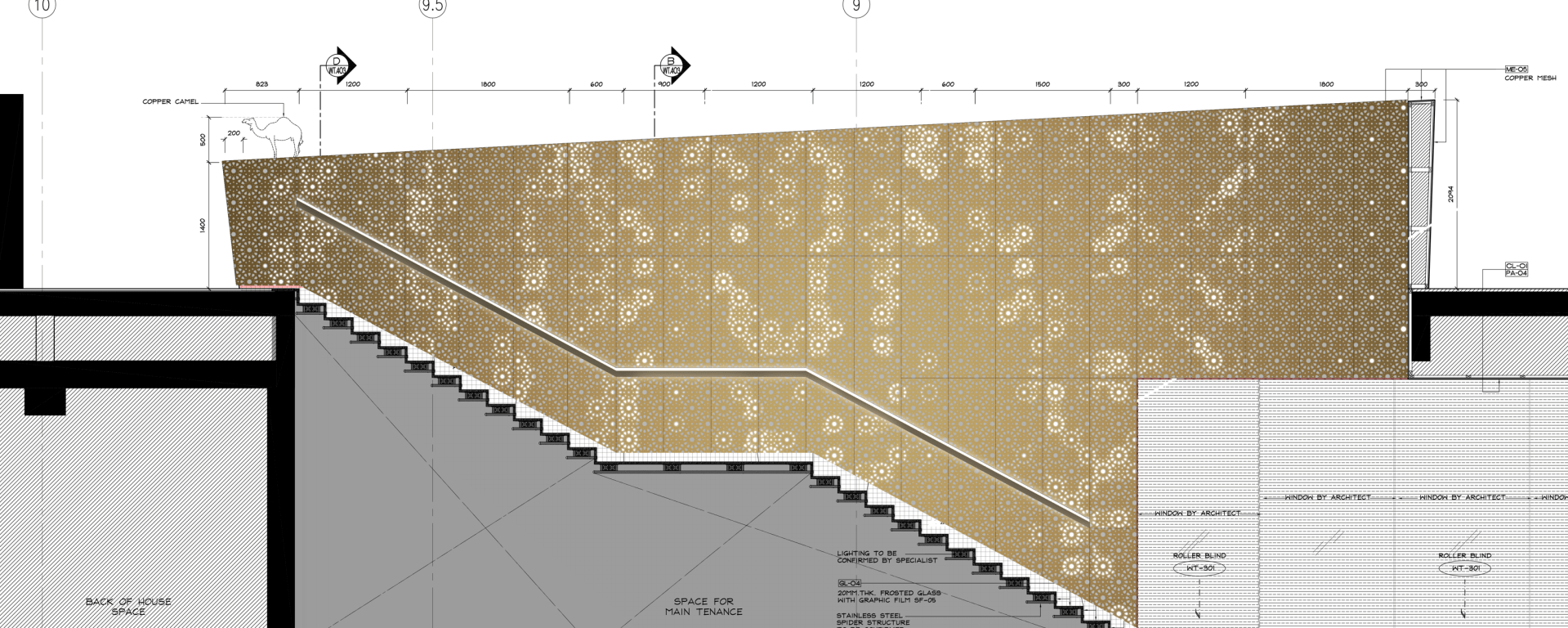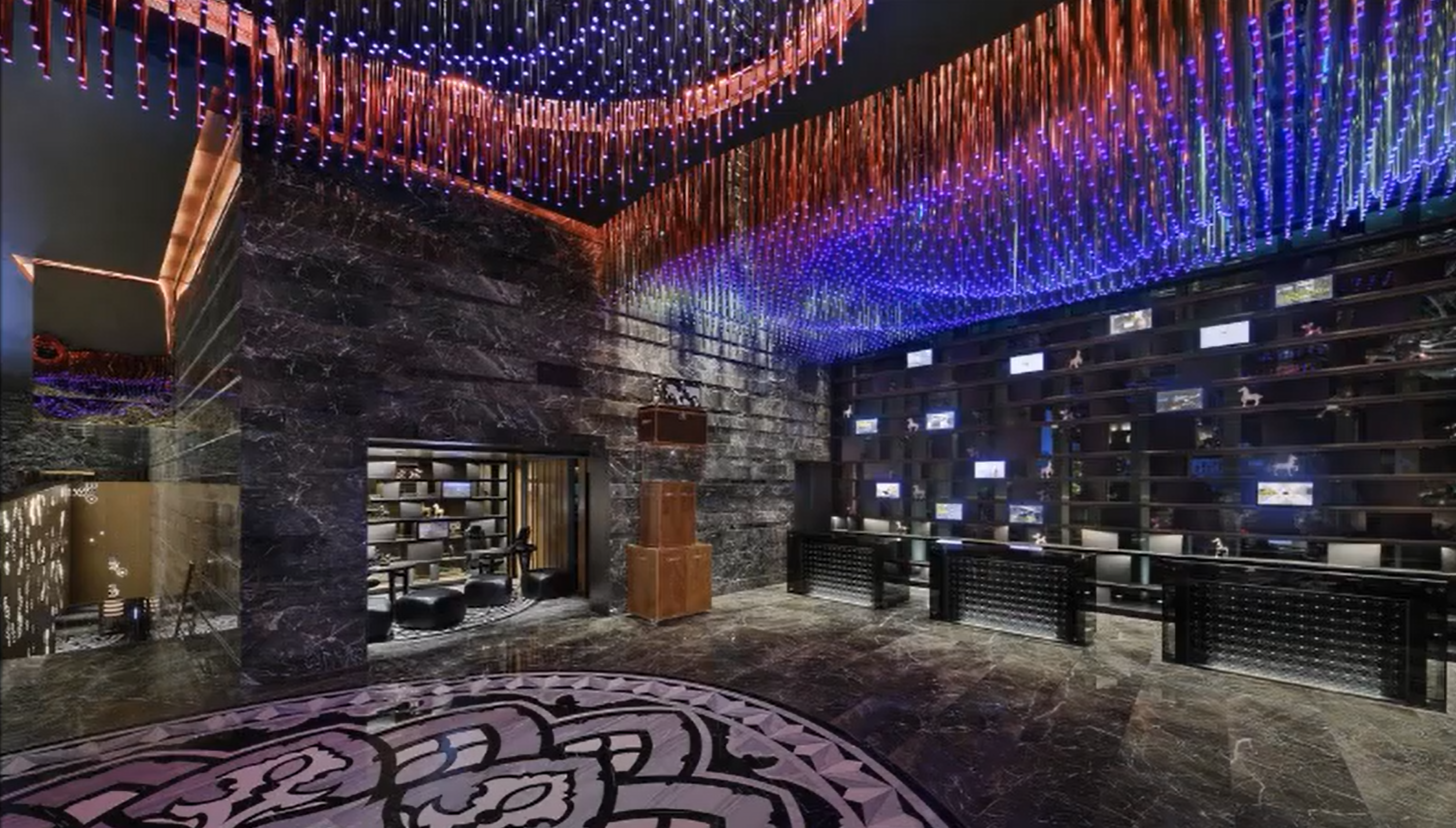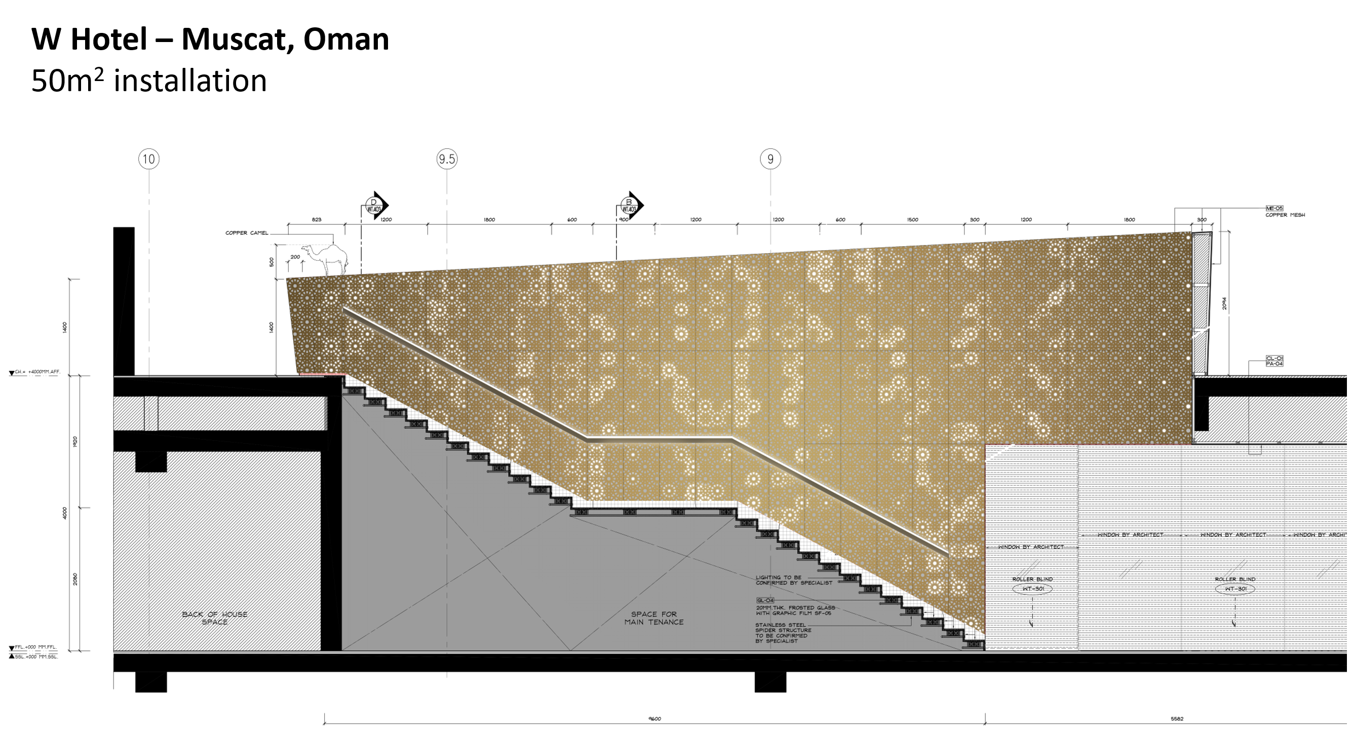 For W Hotels in Muscat, Oman, we designed a gorgeous 2-story high centerpiece wall leading from the main lobby to the elevator lobby, plus a similar refrain of the design for the back walls of the elevator cabs themselves. In the lobby image below, you can just see the wall peeking out from the lower left of the pict.