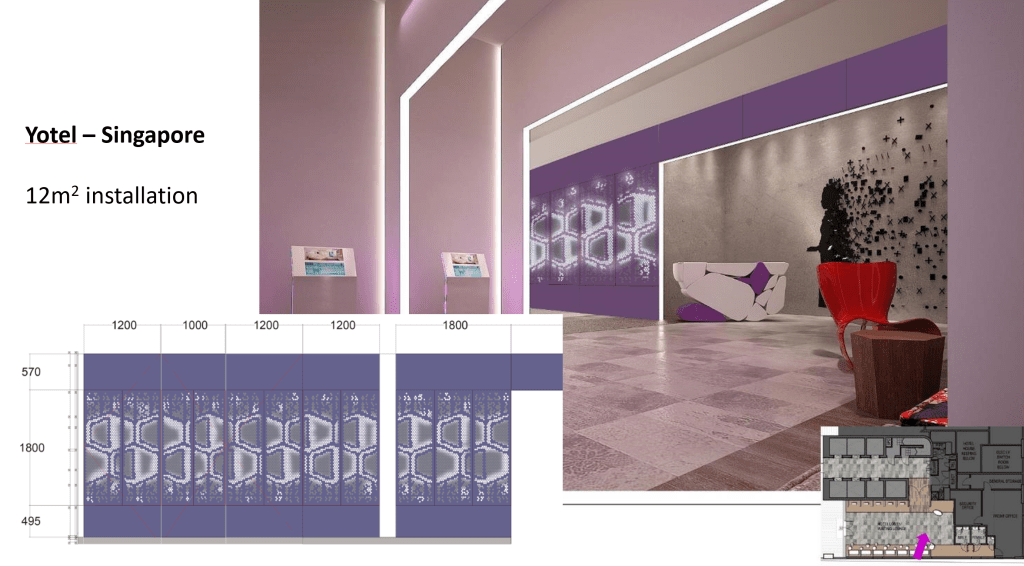 Yotel Singapore: We designed a funky purple animated backlit wall for the elevator lobby. You can just see one small piece of it from the main lobby in the picts below.