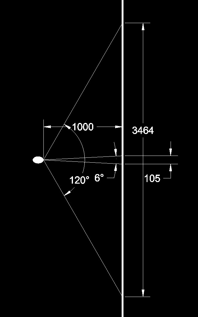 Their field of view of 120-degrees, which means they can see 3,464mm of horizontal width. Requiring 60 pixels per degree field-of-view, that requires 60 pixels x 120 degrees = 7,200 pixels per 3,464 mm of width, or a pixel pitch of 3,464mm/7200 pixels = 0.48 mm pitch.
