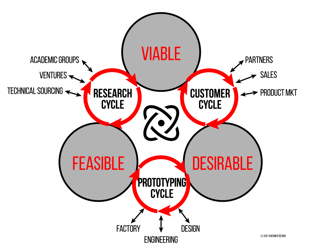 For example, the diagram of how innovation in an organization needs to include not only Product Development but Business Model, Capability Development and Strategy Exploration neatly mirrors my expansion of IDEO’s “Viable-Feasible-Desirable” concept to include perpetual Customer, Research and Prototyping cycles.