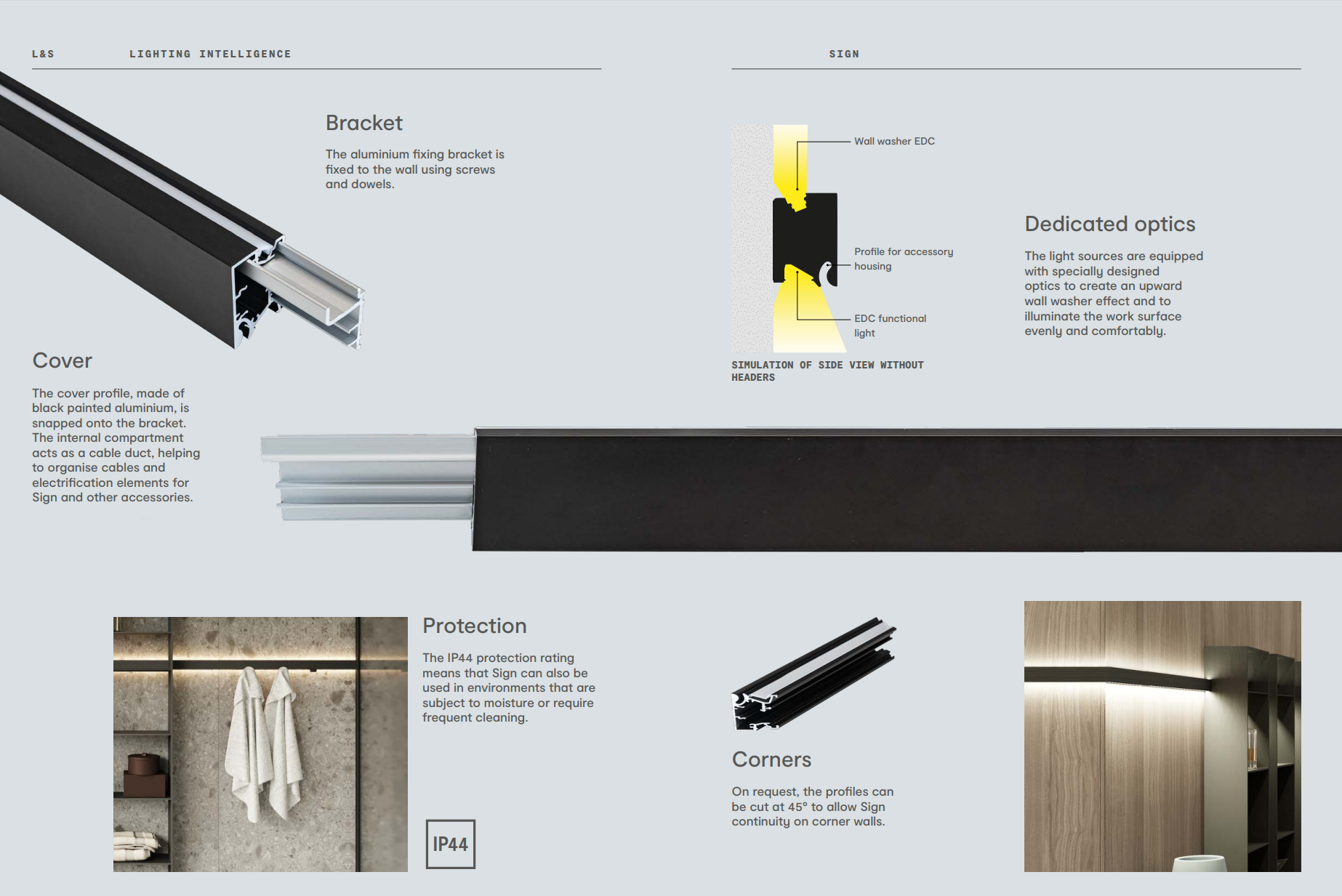 For sure, various styles of incandescent/xenon clickstrip and LED flex strip have been incorporated into cove lighting and architectural details for decades. But that has always been accomplished through fussy construction detailing. This Sign line is really a hybrid of “fussy architectural detail lighting” with a surface mounted rail/furniture system, minus the costly design and integration process. You know a lighting product is treading into new territory when some of the options include “paper towel holder”.