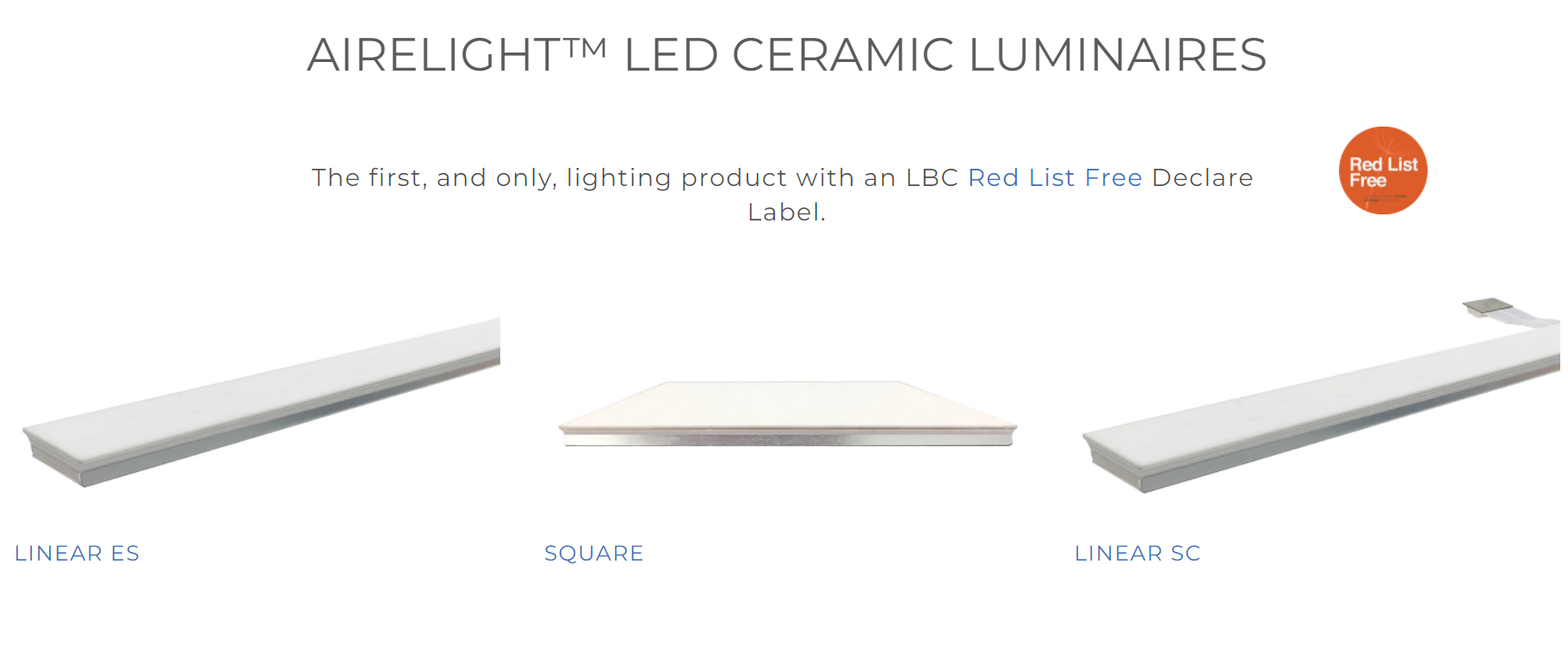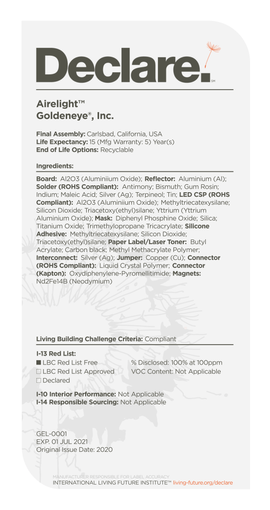 Goldeneye is a California company that back around 2016 launched a very thin, diffused LED light engine/fixture based on a ceramic circuit board and housing. What is most interesting is that in 2020, they achieved an LBC Red List Free Declare Label from the International Living Future Institute.