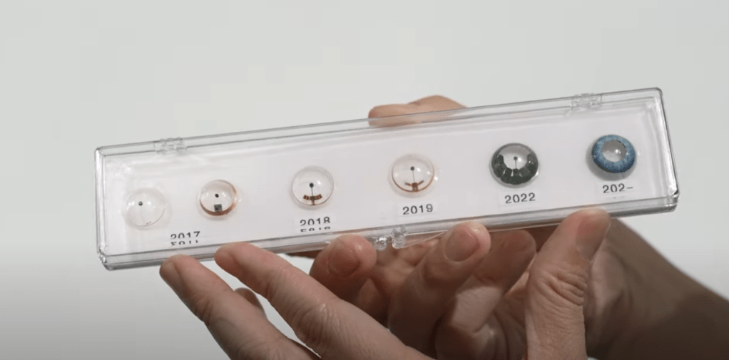 The micro-LED display is 1/2mm across with a density of 14,000 PPI – translating into 280 pixels across the display. The display is designed for a tight 15 degree field of view and integrates with the IMU (inertial measurement unit) to precisely track the movement of the eye so a person can “look around” a broad digital field of content.