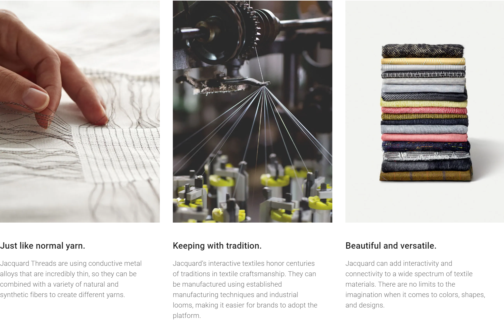 Jacquard is the first full-scale digital technology platform created for smart apparel, footwear, and other everyday essentials. Using advanced hardware, software, unique materials, and textile manufacturing know-how, Jacquard by Google allows our partner brands to integrate connectivity and digital experiences directly into their products.