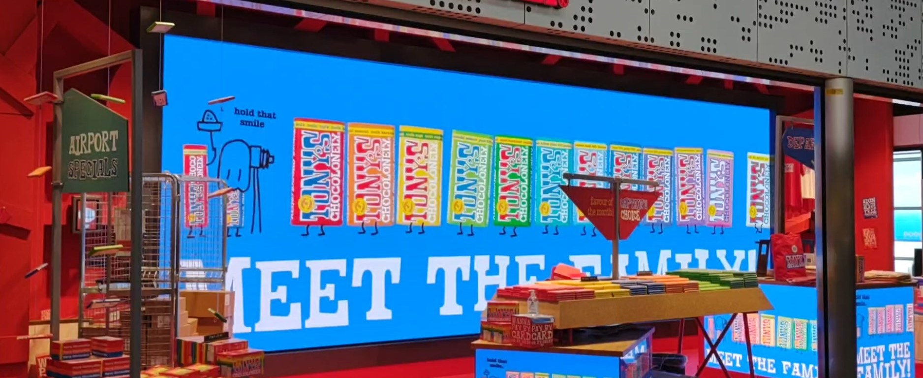 Large format LED walls can provide huge impact on creating a retail brand experience. This store by Tony Chocolonely has very sparse, simple retail merchandise displays, really just 2 islands and a tabletop. But the visual impact of the prime LED video wall at the scale of the high-traffic airport terminal is quite impressive. Plus integrating LED displays down into the merchandise floor units synchronizes and scales the effect.