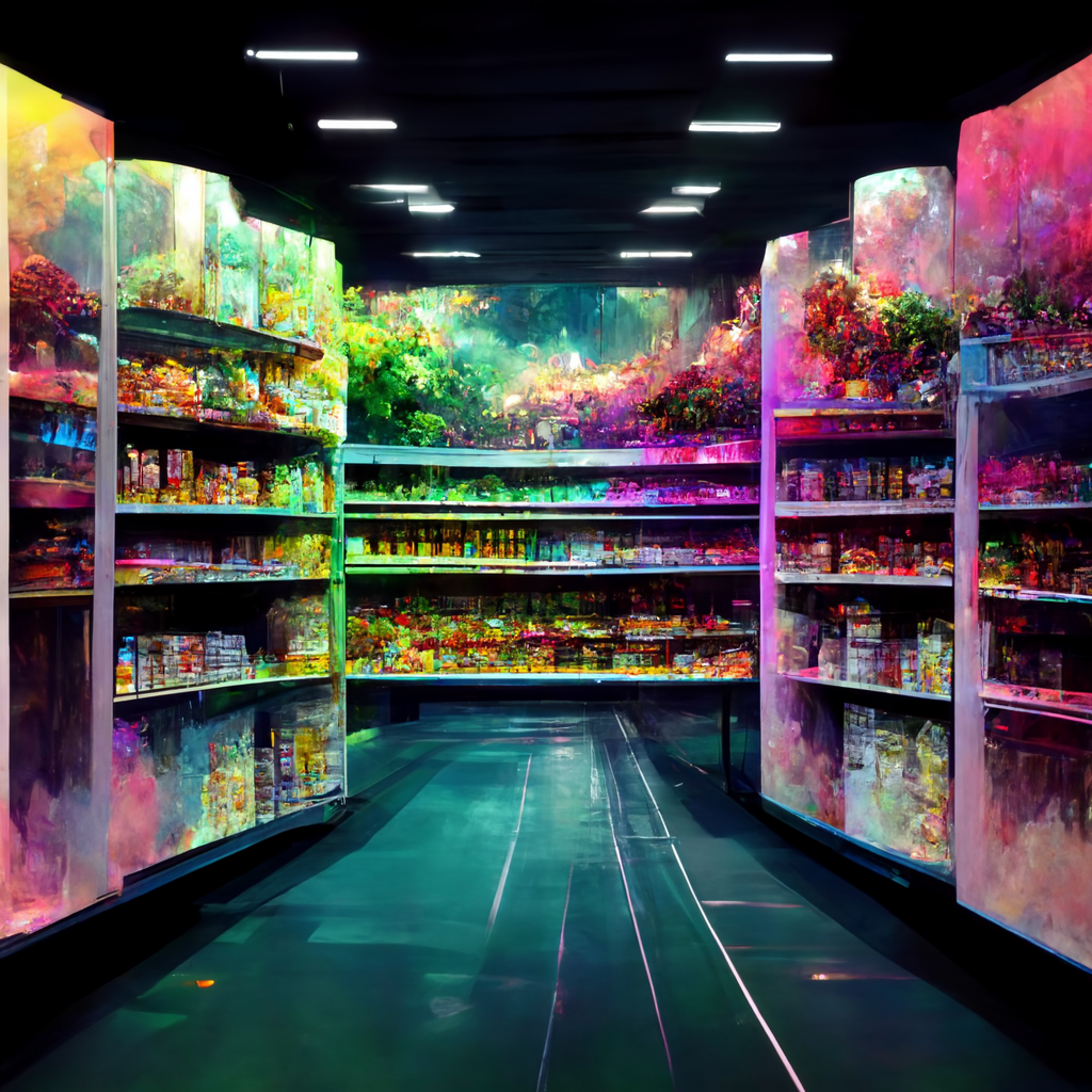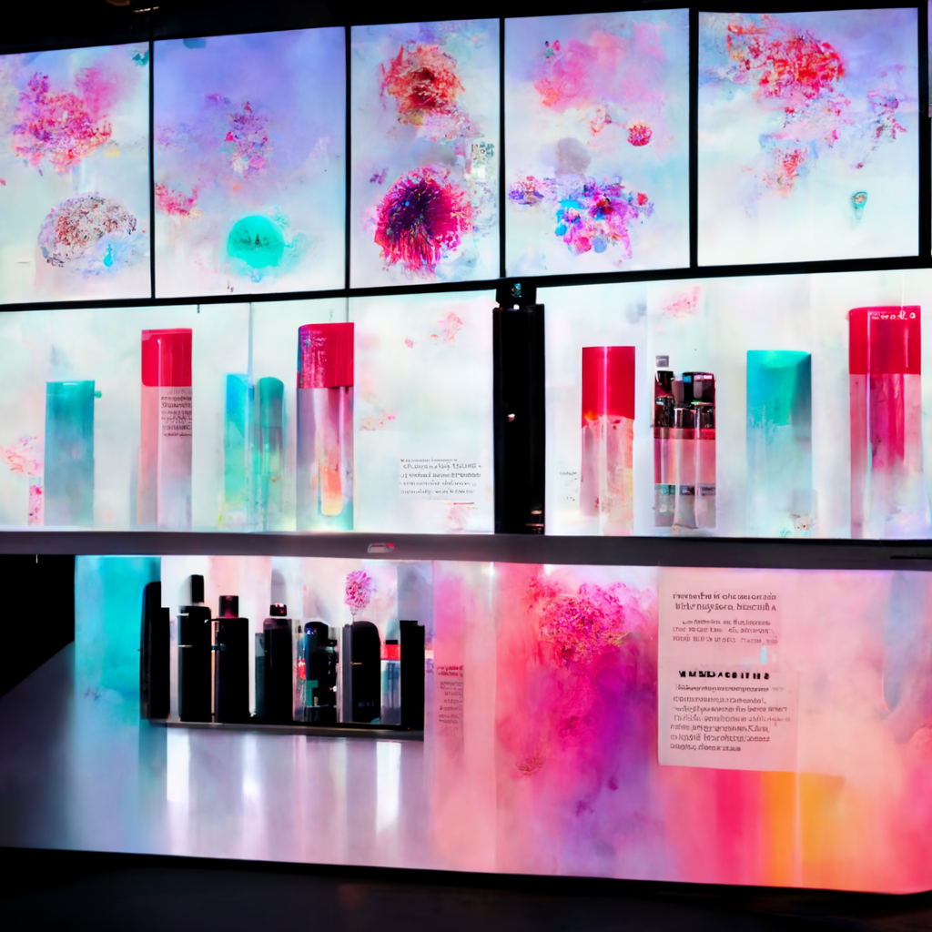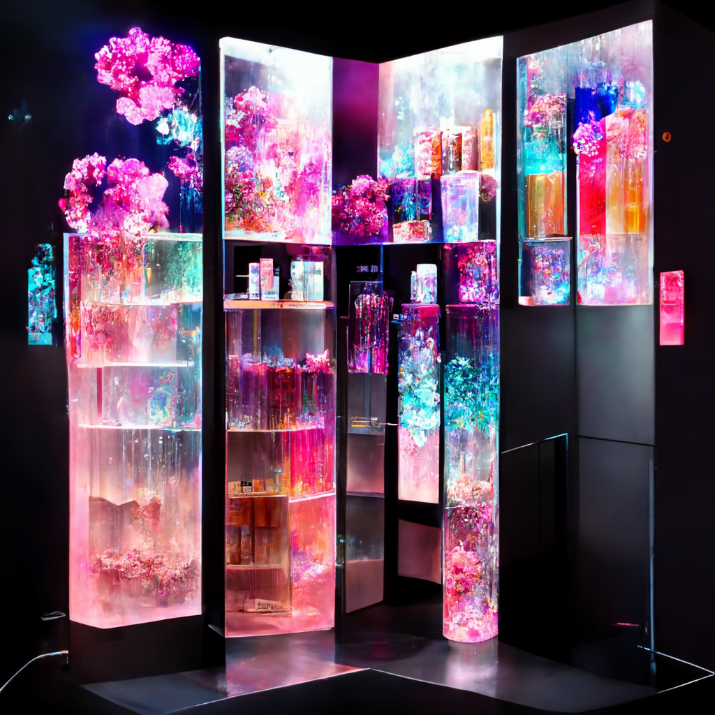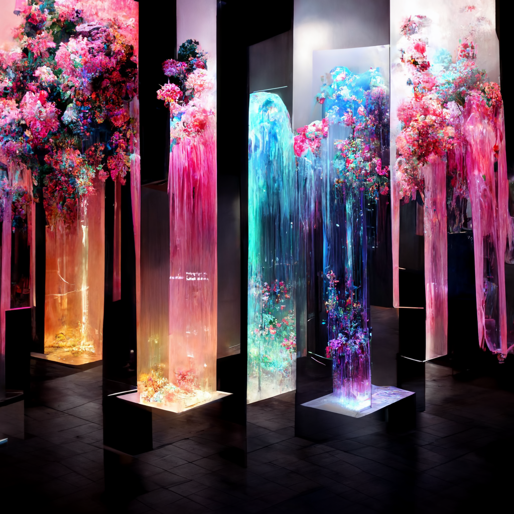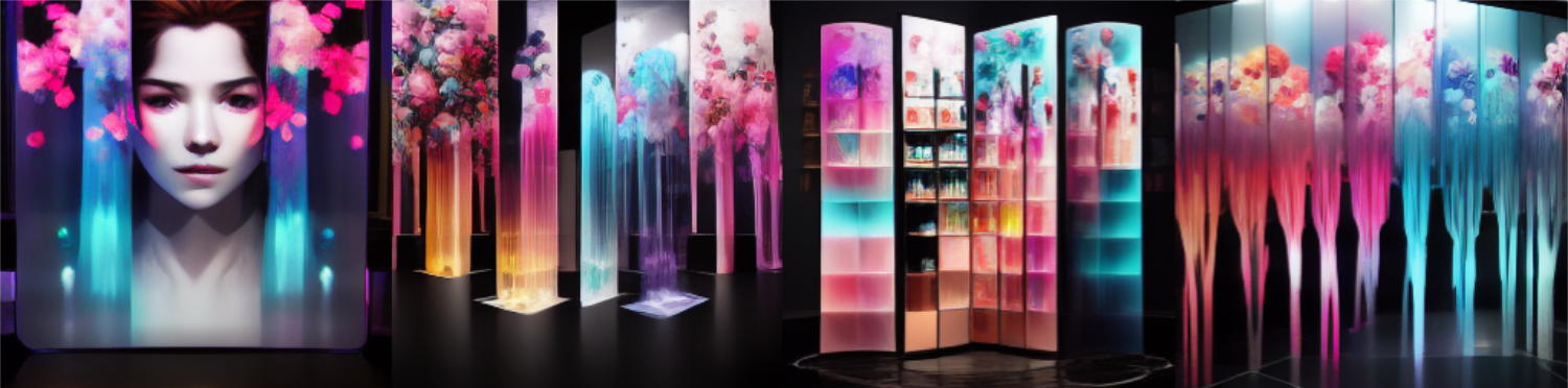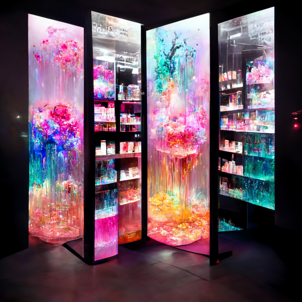 I’ve been messing around using Midjourney AI image generation to explore the fusion of immersive digital experiences in retail and hospitality applications. The random nature of Midjourney is so powerful in creating design “mood boards” — most of the trials are useless, but some of the generations are brilliant in their evocative power, much like a high-level Rorschach test.