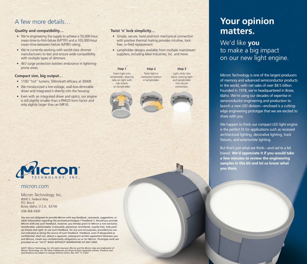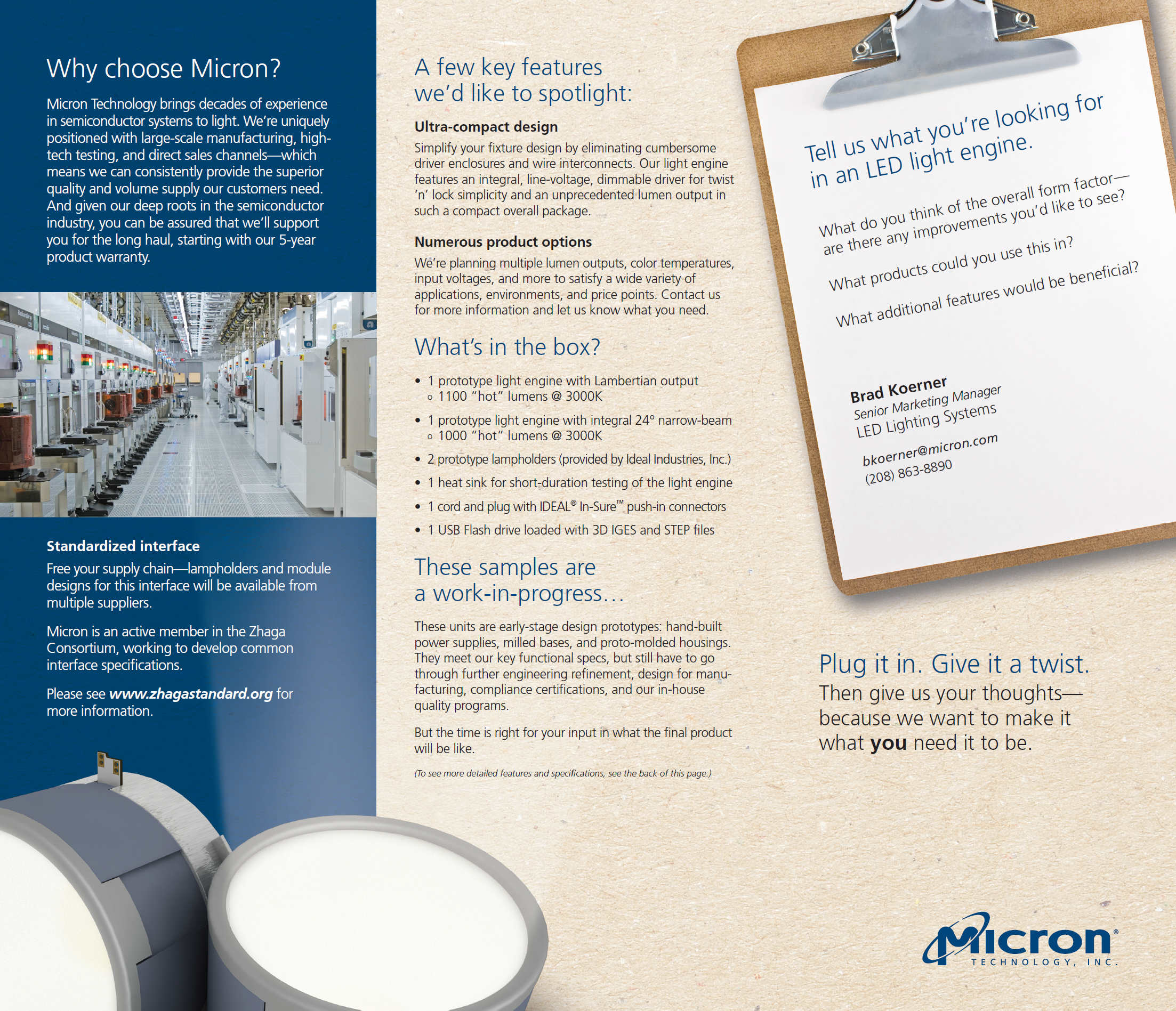 Back in 2009-2011, I joined Micron, one of the world’s largest producers of memory chips. Micron was trying to diversify by reusing an enormous mothballed semiconductor fab in Boise and pursued entering the LED lighting market. At the time, their strategy was largely mimicking Cree, pursuing vertical integration from LED die to modules to fixtures. Which is why I joined as a Senior Product Marketing Manager for LED Systems, where I identified new product categories; drove design and prototyping efforts; proved market validity; managed product roadmap for the architectural lines. I also represented Micron in the nascent Zhaga global standards program for LED components and modules.