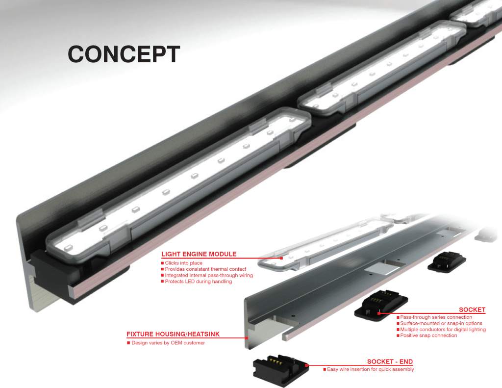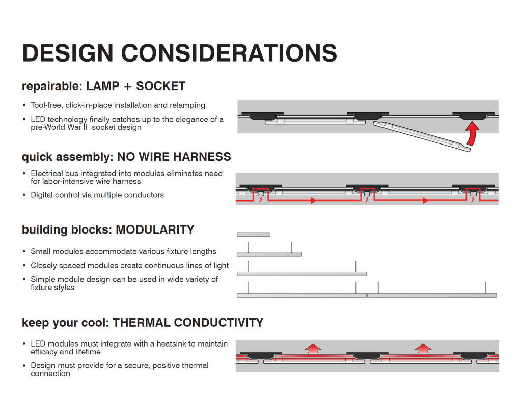 So we developed a solution with beautiful snap-in LED lamp modules that fitted on socket bases between each module. The sockets would be designed by BJB and be very much like standard fluorescent “tombstones” at the time, with snap-in fittings for sheet metal or extrusions and a push-in wire terminal for the start of the line. We started with 6″ modules, which at the time also had the ground-breaking ability to do gentle radius curves. We also planned for longer 24″ modules. Most amazingly, we designed these modules to be line voltage with integral AC/DC dimmable drivers in each. No driver was required at the fixture level for typical triac dimming.